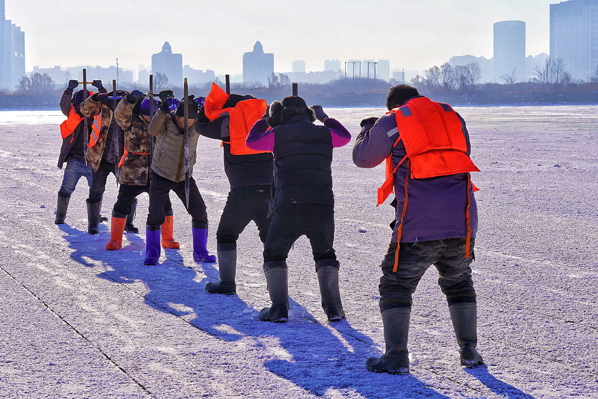 12月10日,黑龙江哈尔滨,工人们并排用冰镐分离冰块。当日,在松花江哈尔滨段江面上,采冰工人正在进行采冰作业,所采的冰将被运往冰雪大世界用于制作大型冰雕。(图片来源:中新社)