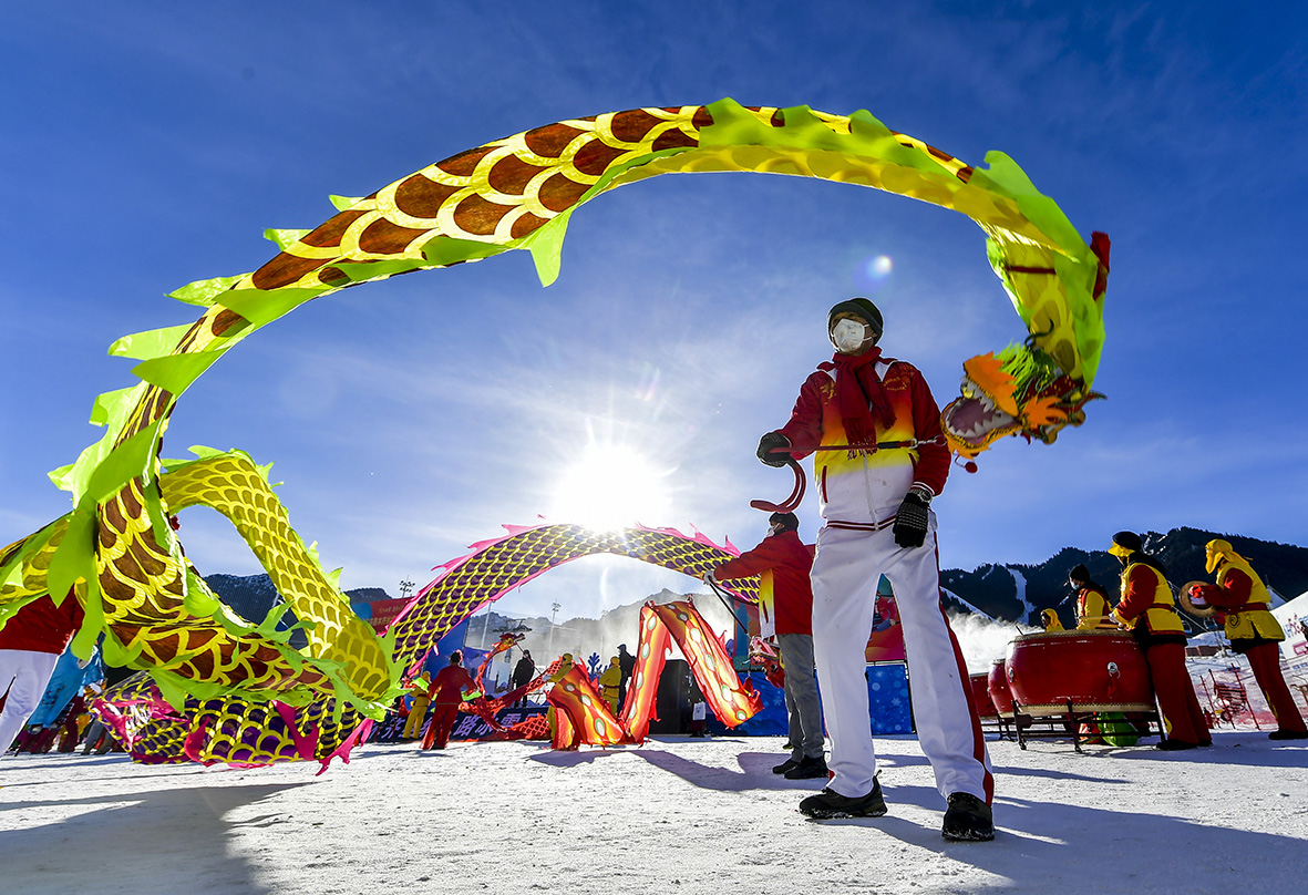12月14日,第二十届乌鲁木齐丝绸之路冰雪风情节在新疆乌鲁木齐市南山景区开幕,正式拉开了该市2022-2023冬季旅游活动的帷幕。图为开幕式现场的舞龙表演。 (图片来源:中新社)
