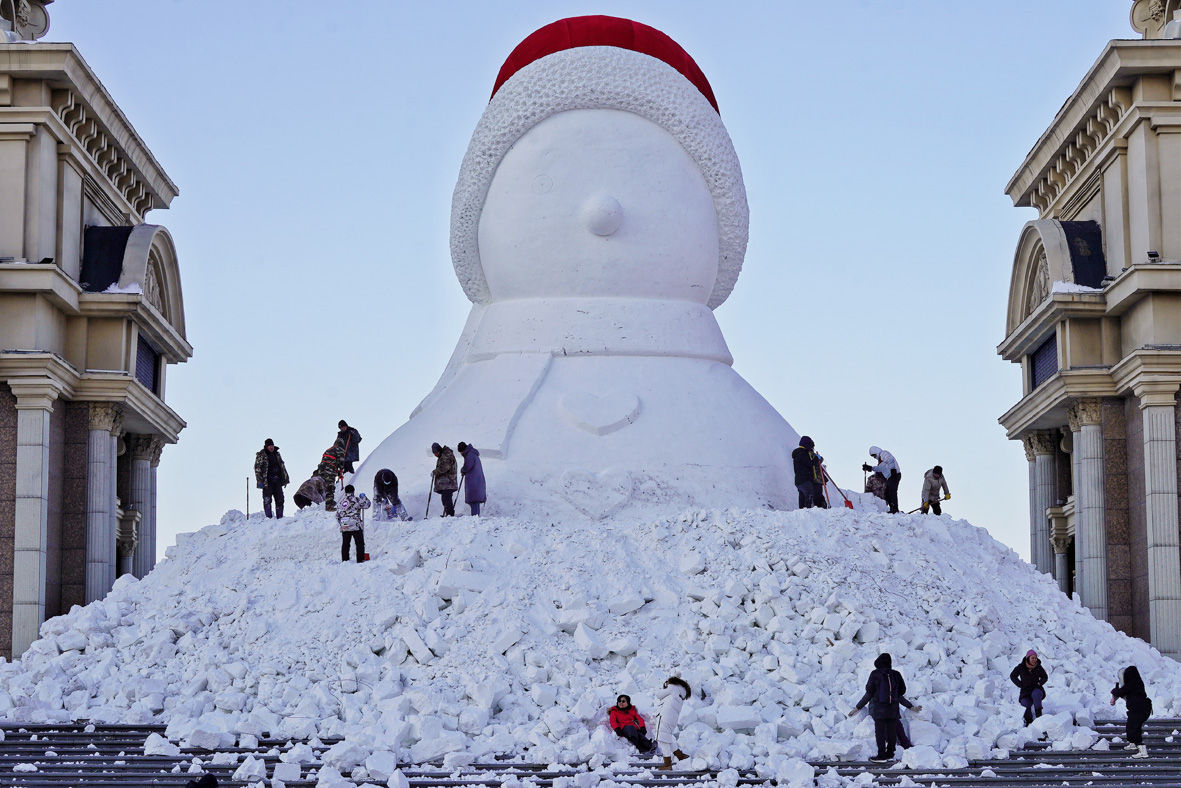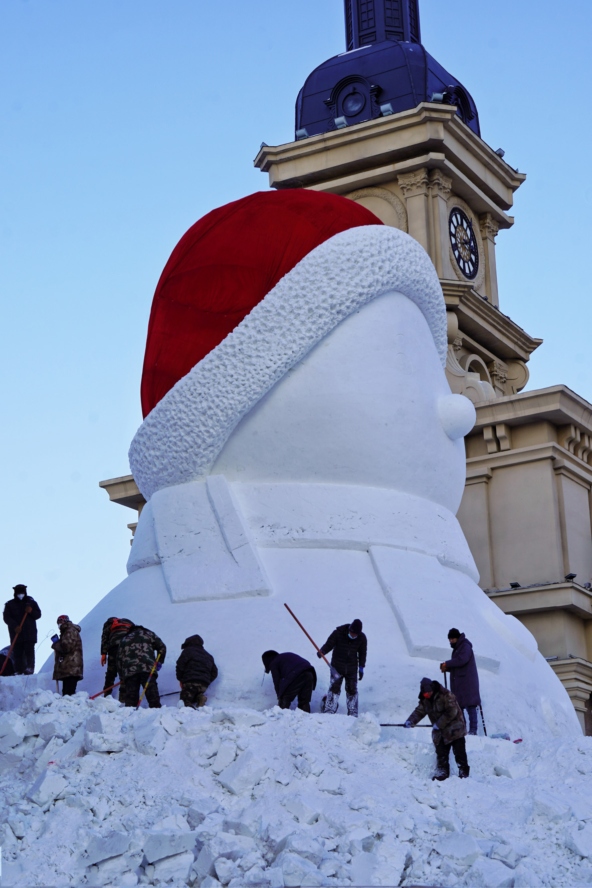 1月2日,哈尔滨市群力音乐公园,工人们正在雪人雪雕上施工。(图片来源:中新社)