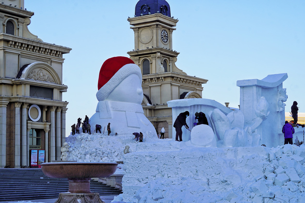 1月2日,哈尔滨市群力音乐公园,“大雪人”旁的主题雪雕也在建设中。(图片来源:中新社)