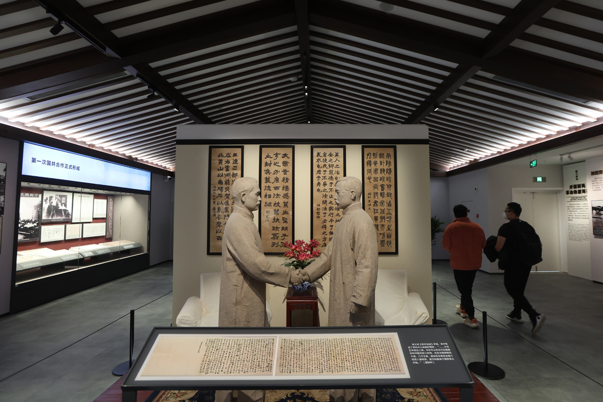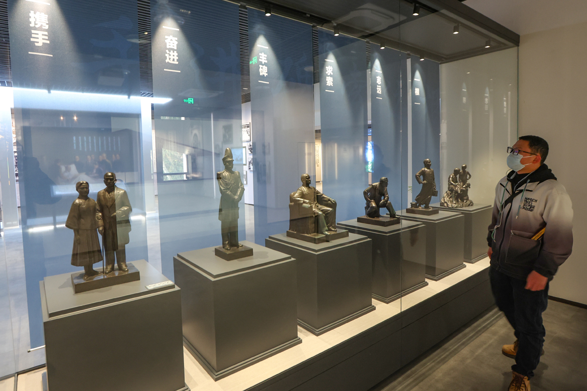 1月3日,游客在迁址后的南京中山陵孙中山纪念馆内参观展览《世纪伟人—孙中山生平史迹展》,图中雕像再现了李大钊同孙中山会晤的场景。孙中山纪念馆原本位于南京中山陵以东的藏经楼(藏经楼为中山陵附属纪念性建筑之一,建于20世纪30年代,1987年藏经楼被改辟为孙中山纪念馆),现搬迁至中山陵中轴线博爱坊东侧嘉麟楼。近日,该馆经过维护修整、展陈布置,对外试运行。(图片来源:中新社)