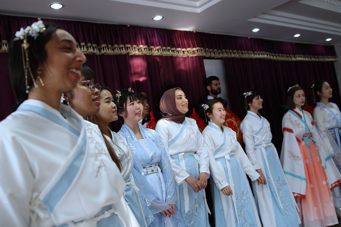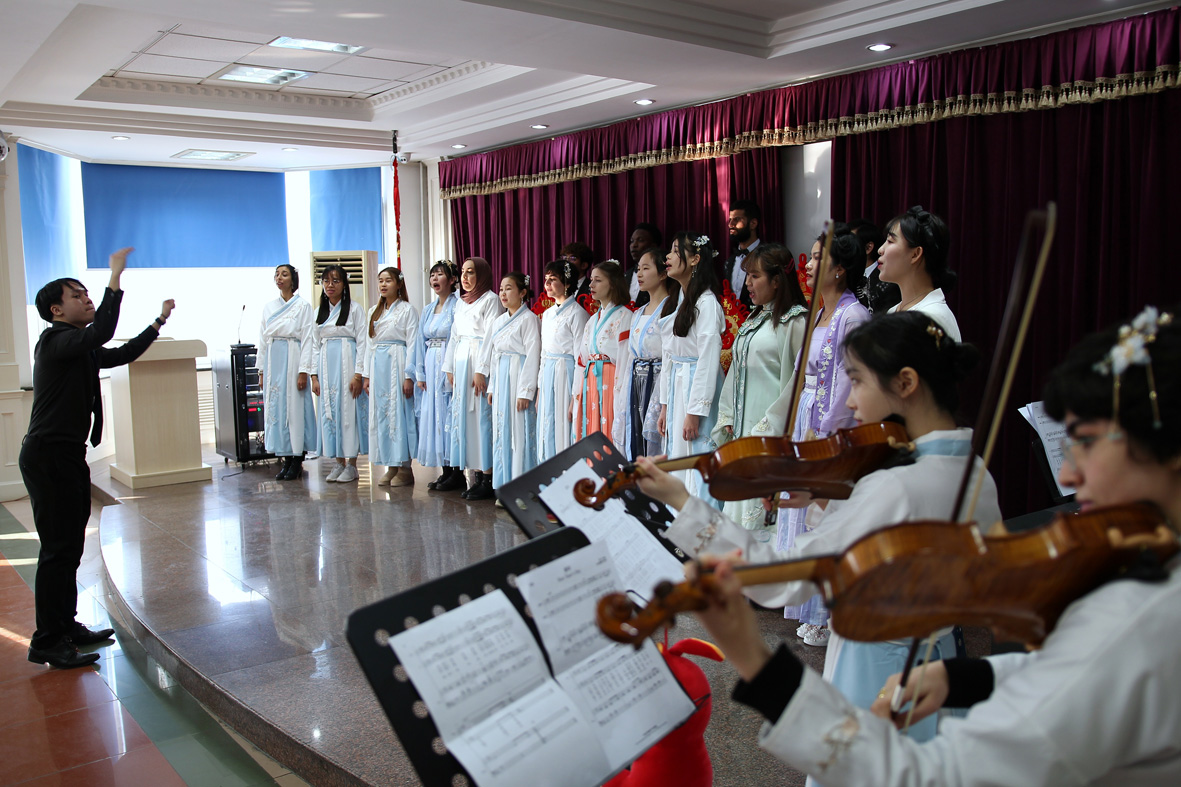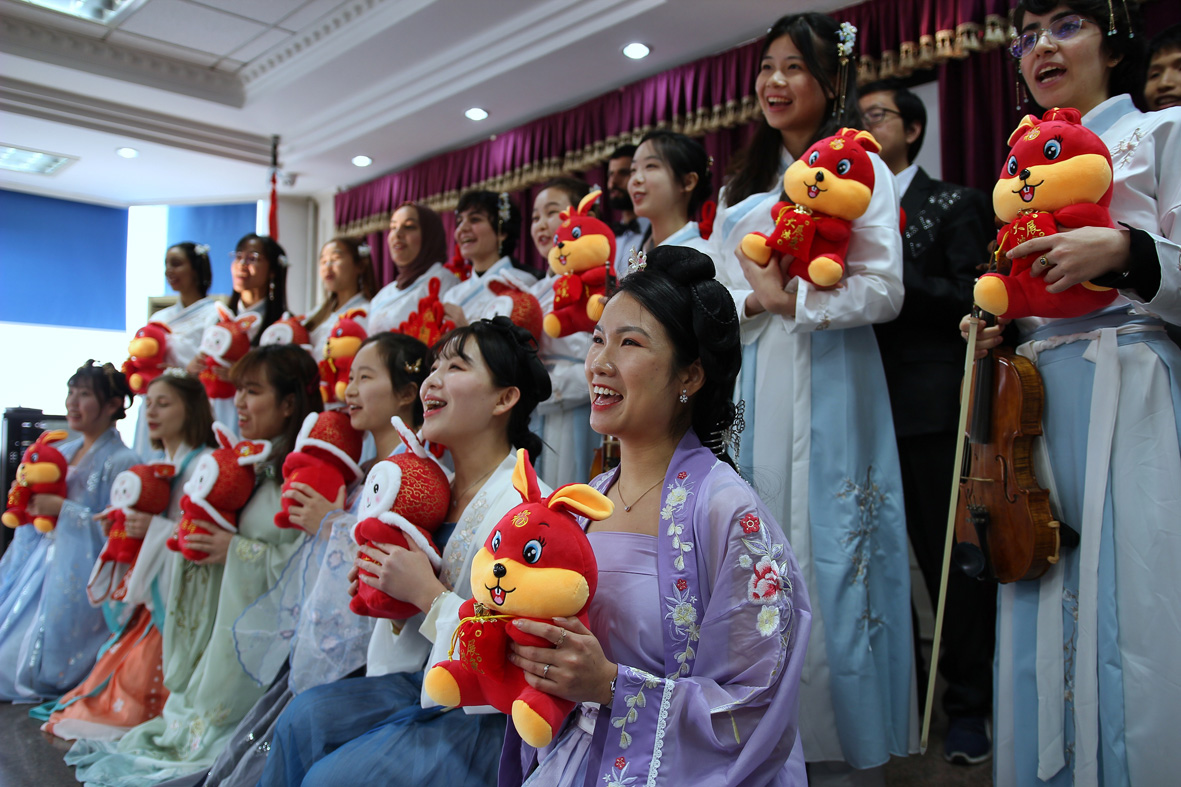 1月4日,天津大学国际教育学院来自俄罗斯、加拿大、马来西亚、越南等国家的留学生为迎接中国农历新年,身穿汉服排练“校园春晚”中文合唱等节目,感受中国传统文化魅力。(图片来源:中新社)