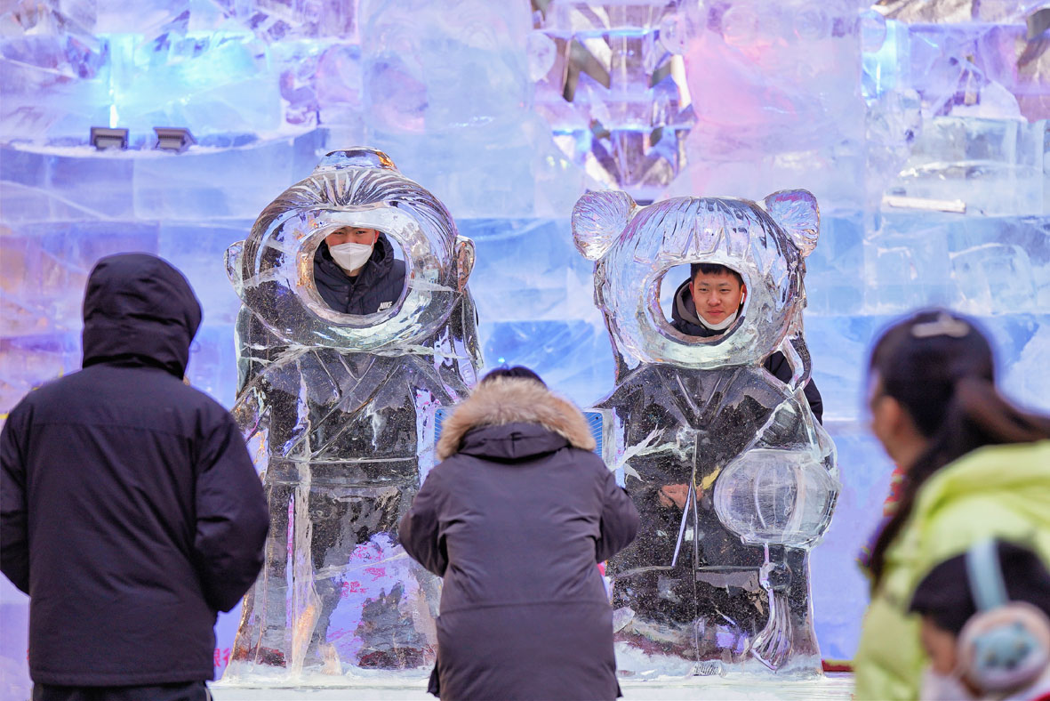 1月4日,哈尔滨中央大街,市民在修建好的造型冰雕旁拍照。近日,在黑龙江哈尔滨“百年老街”中央大街上,一座座造型冰雕正在修建中,吸引民众拍照“打卡”。(图片来源:中新社)