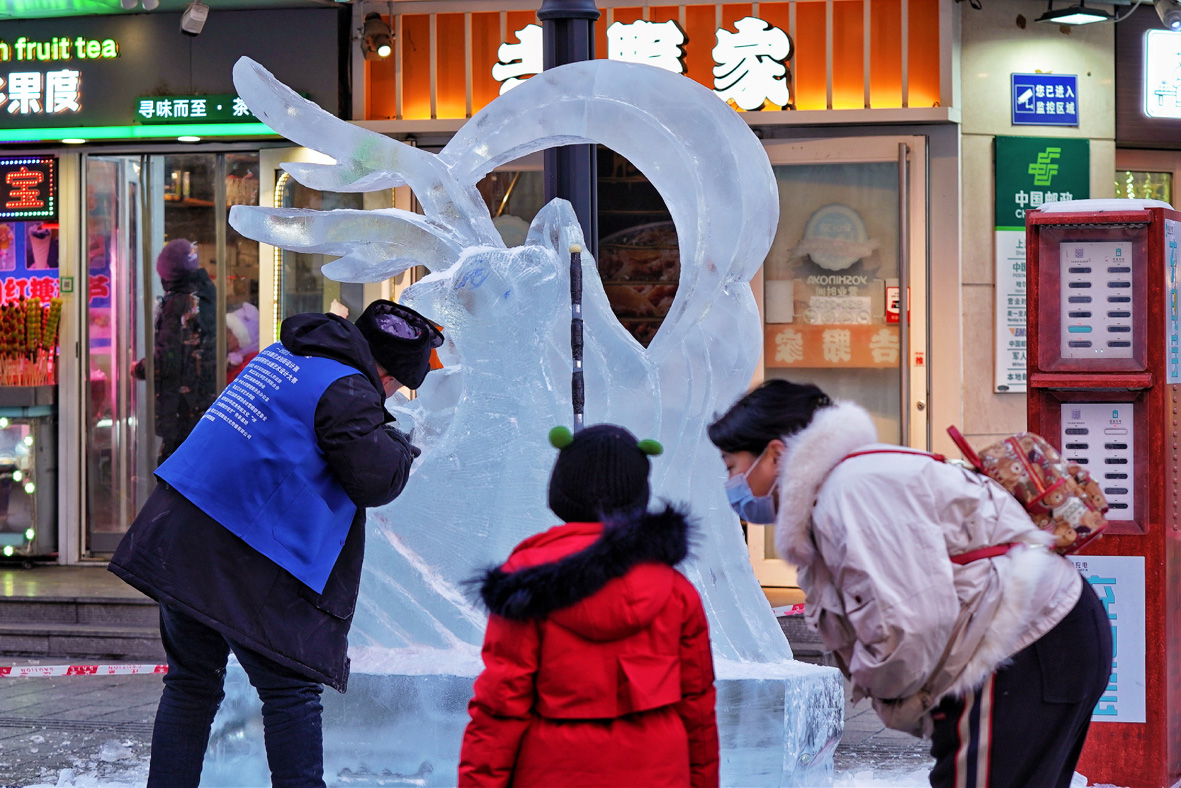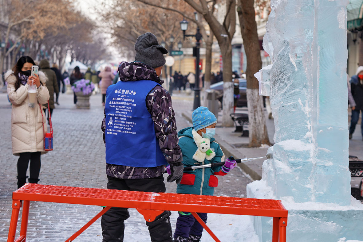 1月4日,哈尔滨中央大街,冰雕师修建冰雕,吸引市民观看。(图片来源:中新社)
