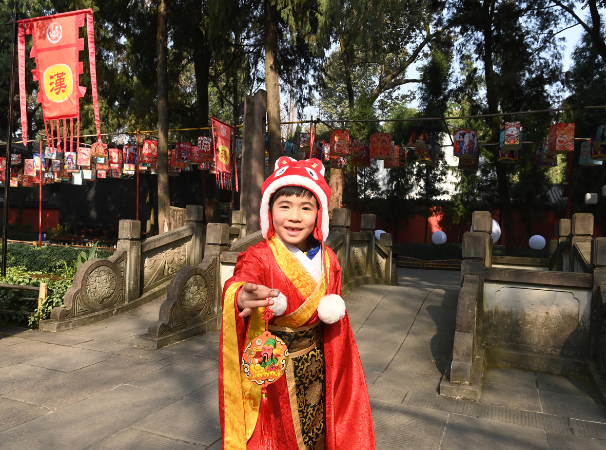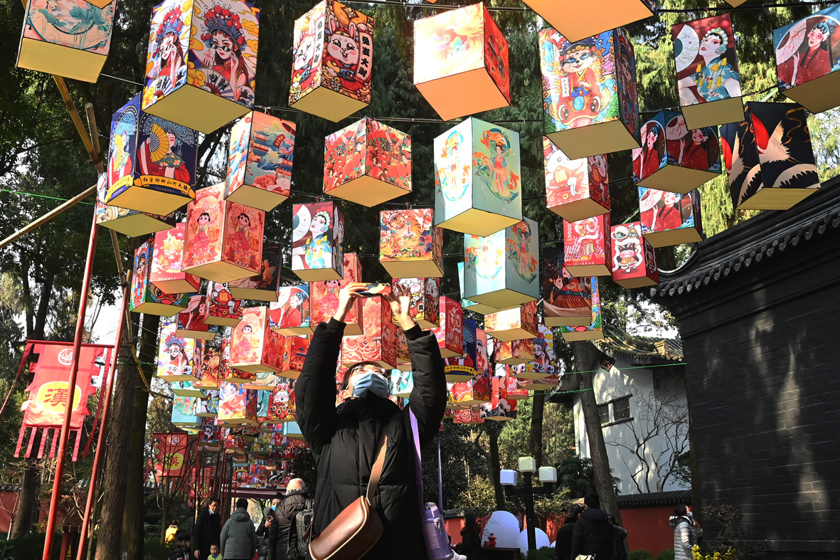 1月19日,“2023武侯祠成都大庙会”在成都启幕。本届大庙会将举办文化展览、仿古祭祀、国潮戏曲、氛围彩灯、美食集市、非遗文创等各项活动。图为大庙会灯饰吸引游客。(图片来源:中新社)