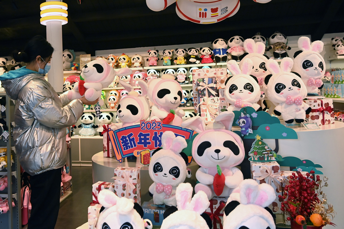图为游客选购具有兔年主题的熊猫玩偶。 (图片来源:中新社)