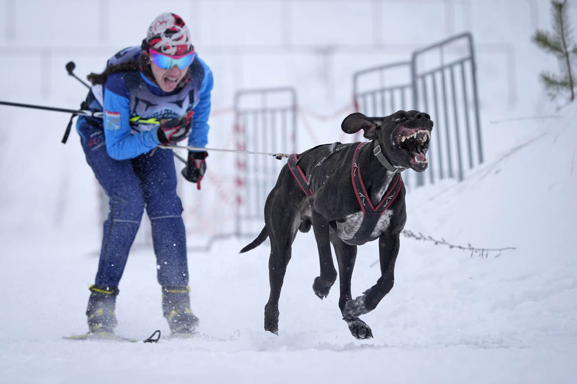 2月19日,俄罗斯圣彼得堡,一名女子带着她的狗在雪橇犬比赛中滑雪。(图片来源:CFP)