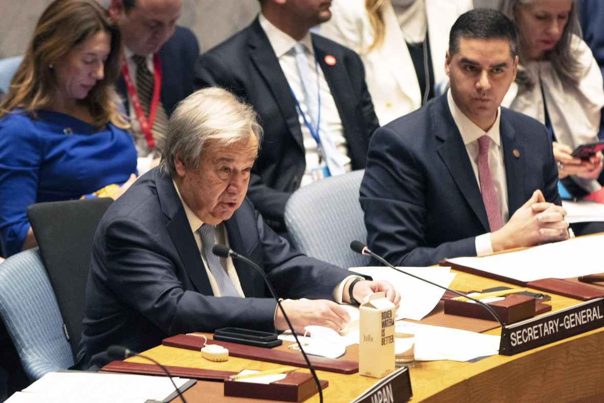 当地时间2月24日,联合国安理会在纽约联合国总部举行乌克兰问题公开会。图为联合国秘书长古特雷斯在会上发言。 (图片来源:中新社)