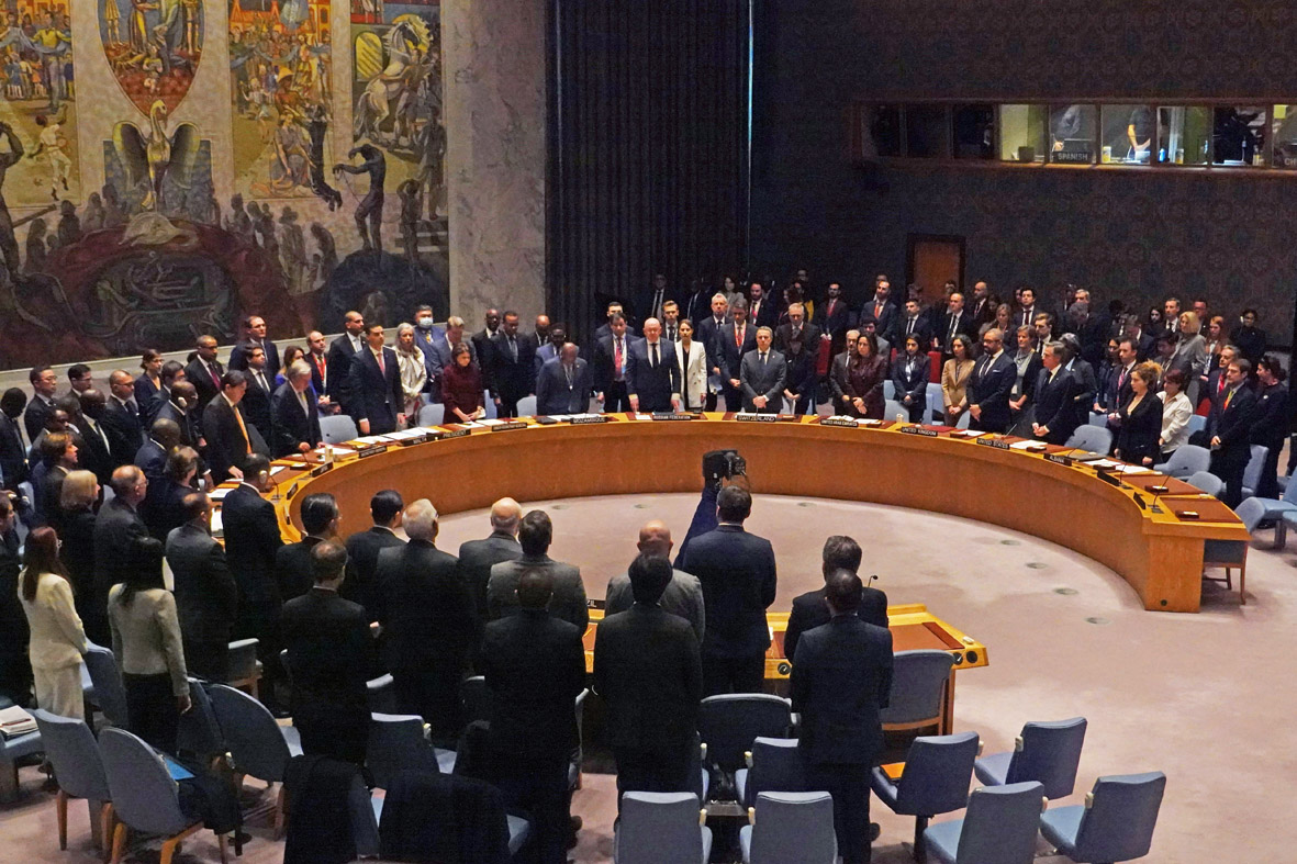 当地时间2月24日,联合国安理会在纽约联合国总部举行乌克兰问题公开会。图为全体代表起立为俄乌冲突遇难者默哀。 (图片来源:中新社)