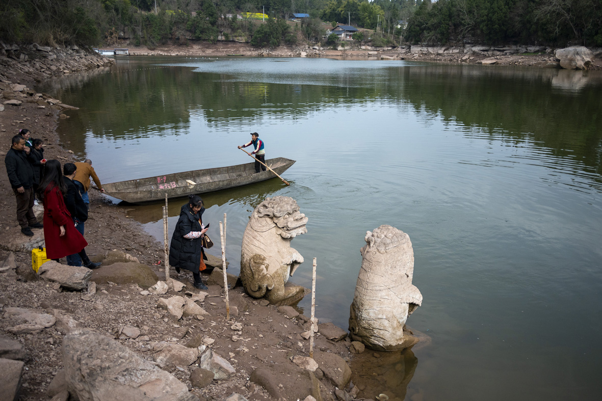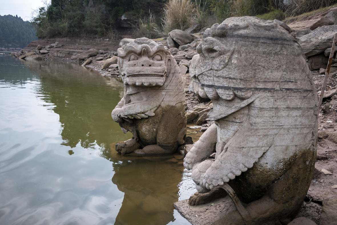 3月1日,受春耕用水增加和降雨持续减少影响,四川省安岳县书房坝水库水位持续下降,部分被淹没于水位之下的唐宋时期摩崖石窟造像露出真容,吸引不少民众前往观赏。图为露出水面的石狮子。 (图片来源:中新社)