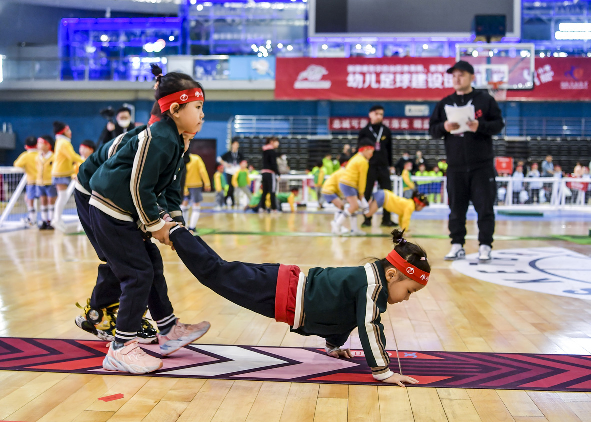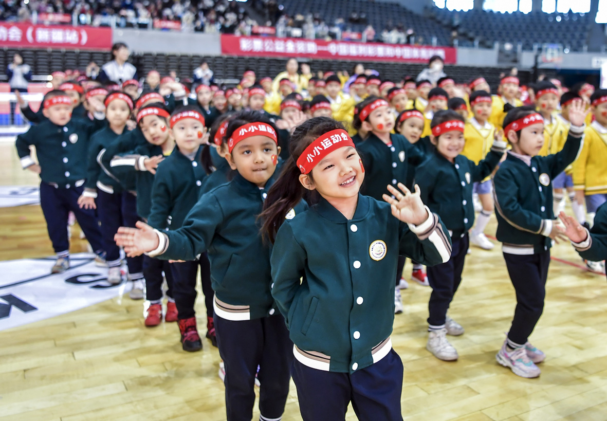 3月1日,全国幼儿体育小小运动会(新疆站)比赛在乌鲁木齐举行,来自乌鲁木齐市8所幼儿园的小朋友参与了8个项目的角逐。图为开幕式上,小朋友跟着音乐节奏跳操。(图片来源:中新社)