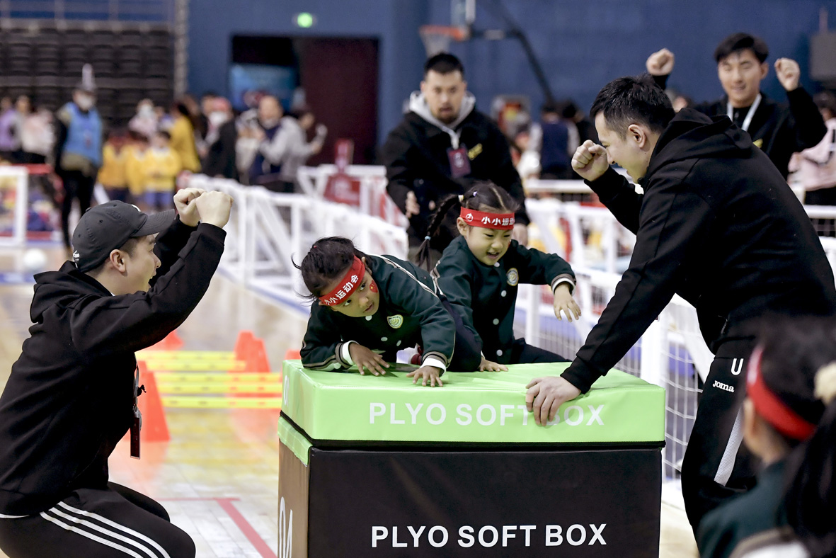 图为小朋友参与力量三人行比赛。(图片来源:中新社)