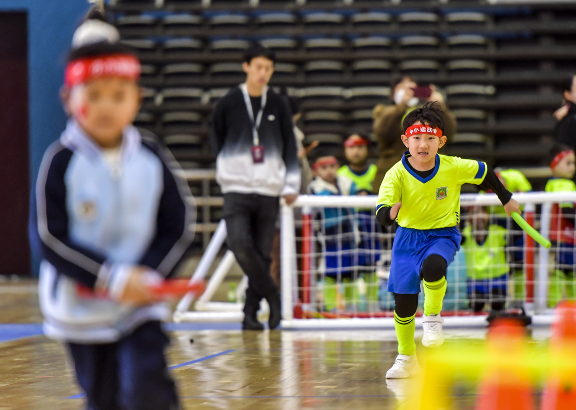 图为小朋友在环形接力赛比赛中奋力追赶前方选手。(图片来源:中新社)