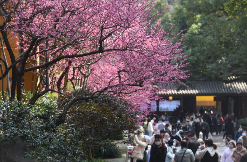 3月2日,游人在灵隐寺梅花树下游览。近日,浙江杭州千年古刹灵隐寺内各色梅花盛开,吸引游人观赏打卡。(图片来源:中新社)