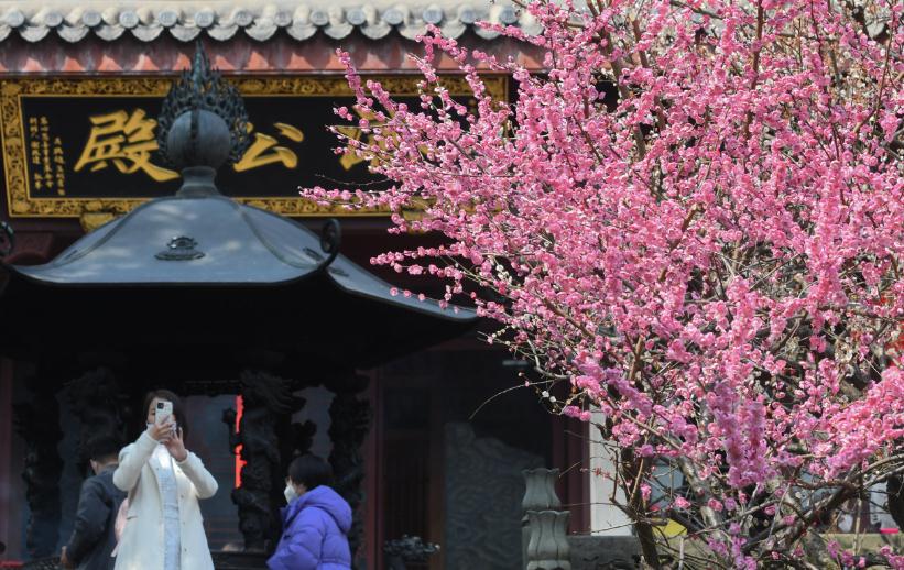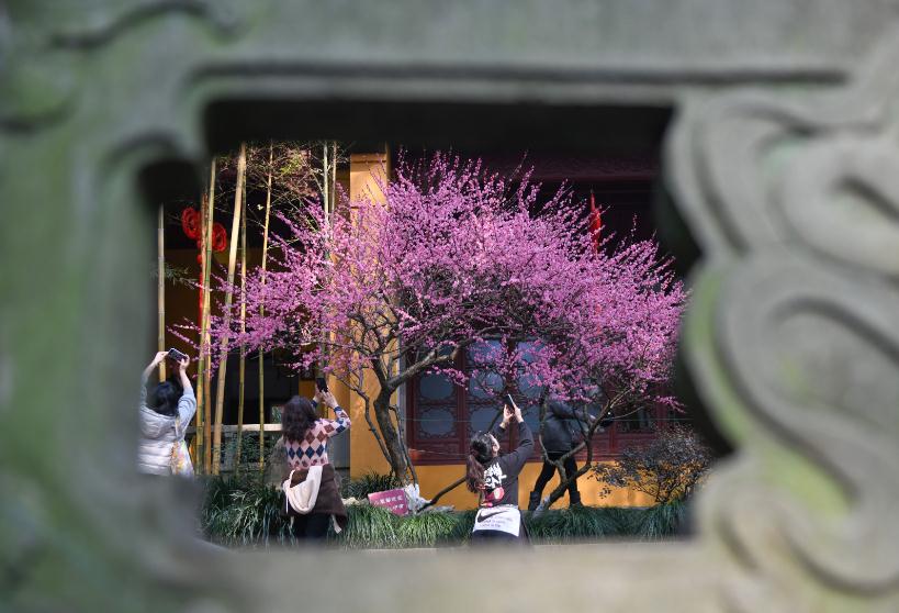 游人在灵隐寺内拍摄梅花。(图片来源:中新社)