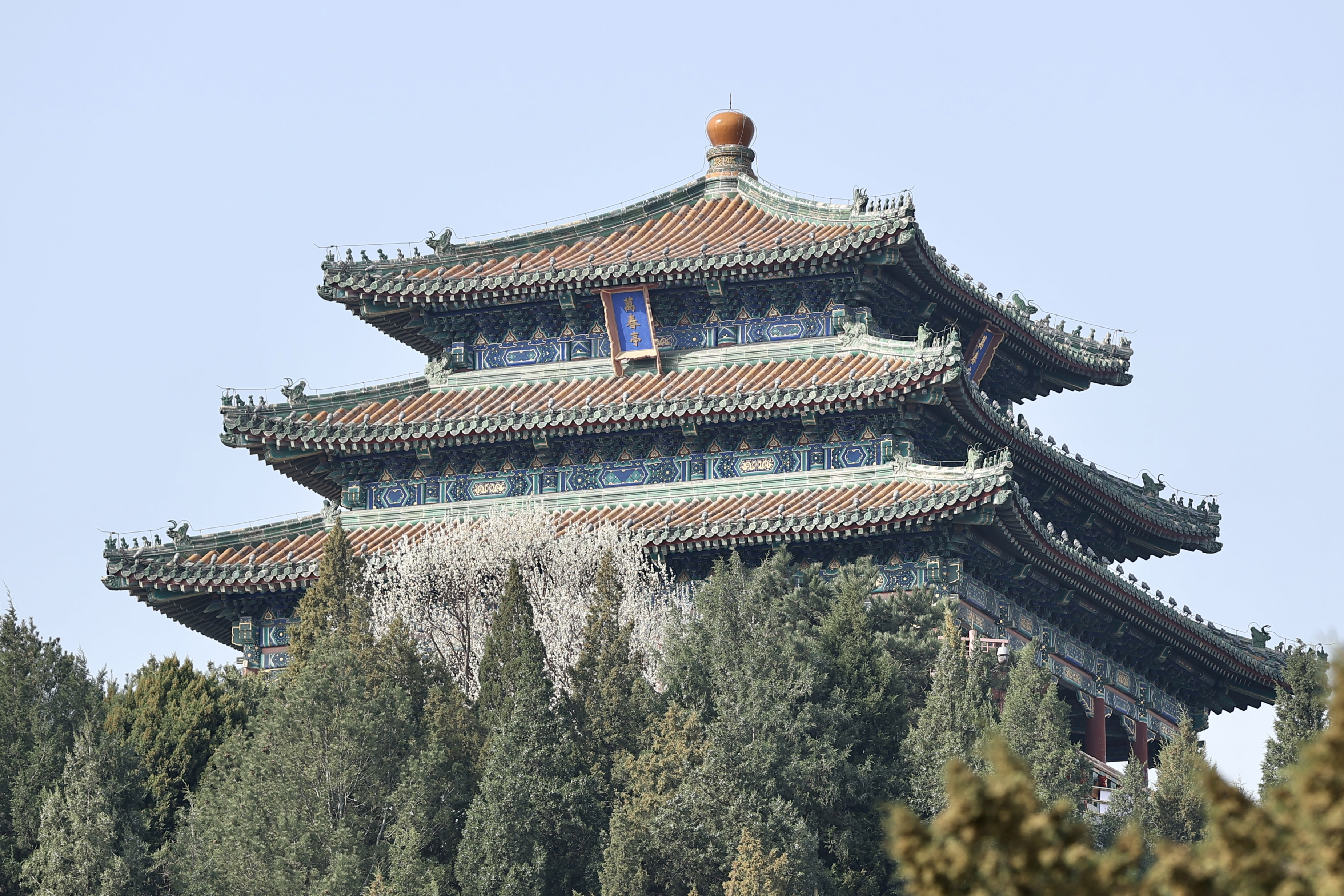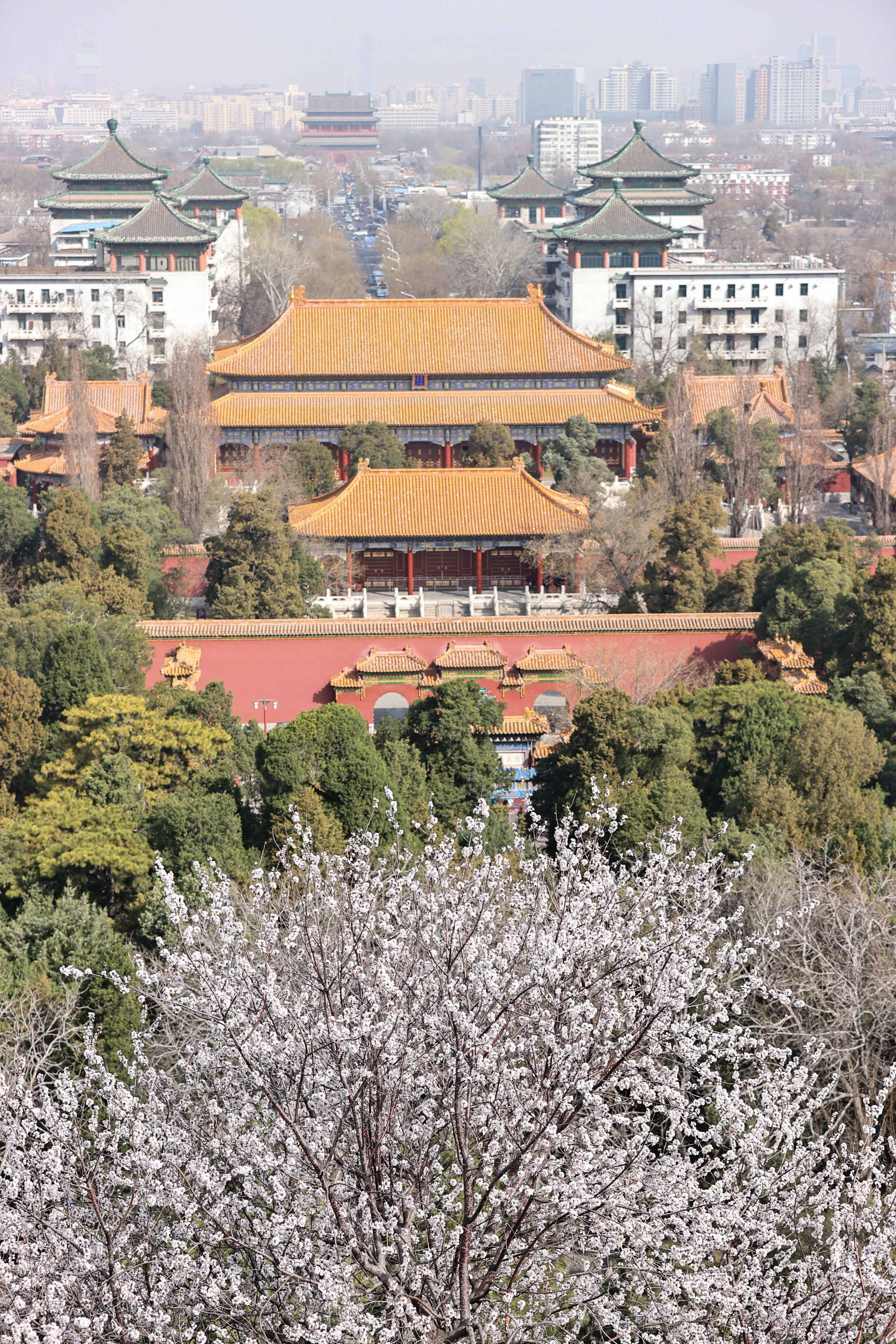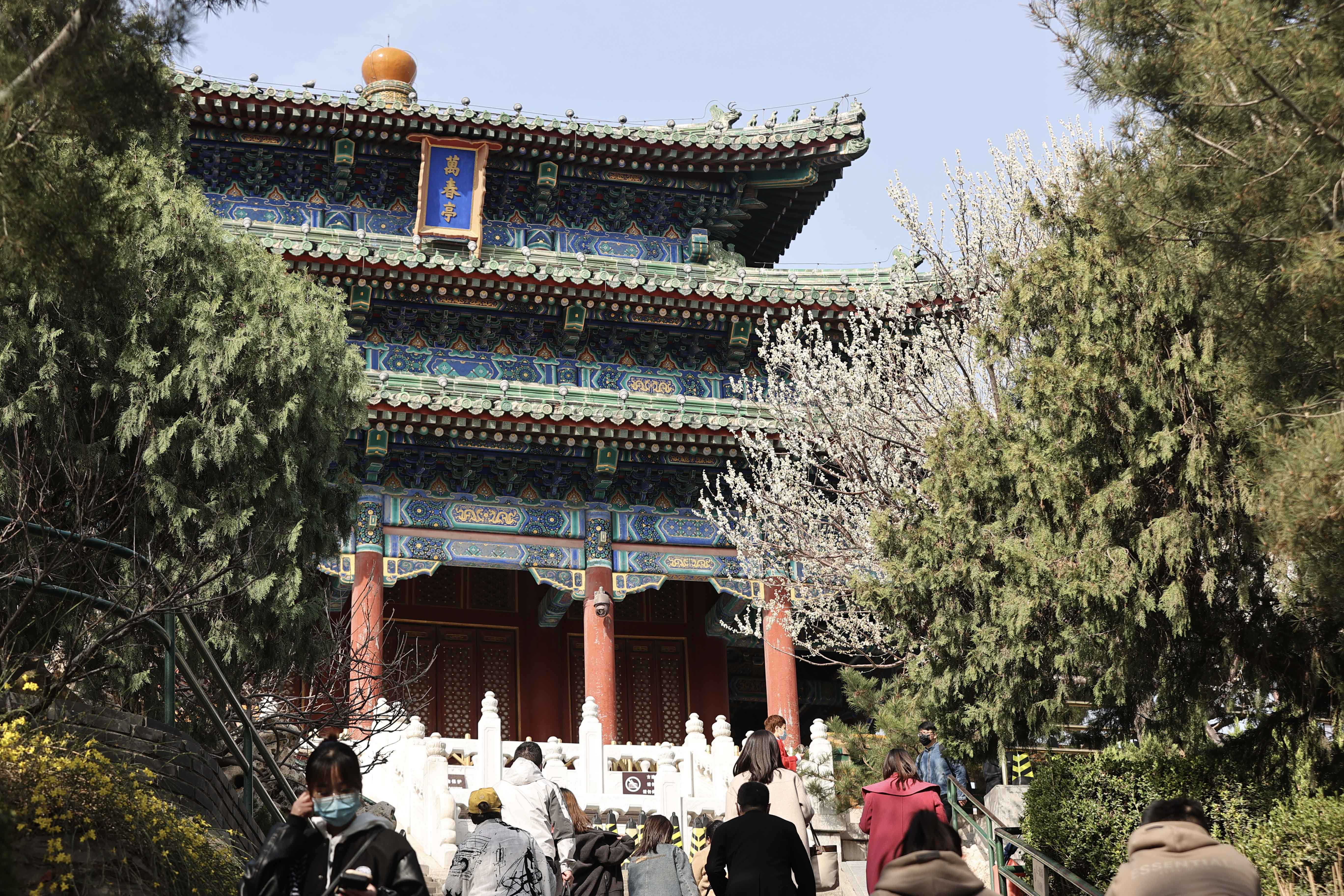 3月14日,仲春时节,北京景山万春亭旁山桃花开放,吸引游客观赏。(图片来源:中新社)