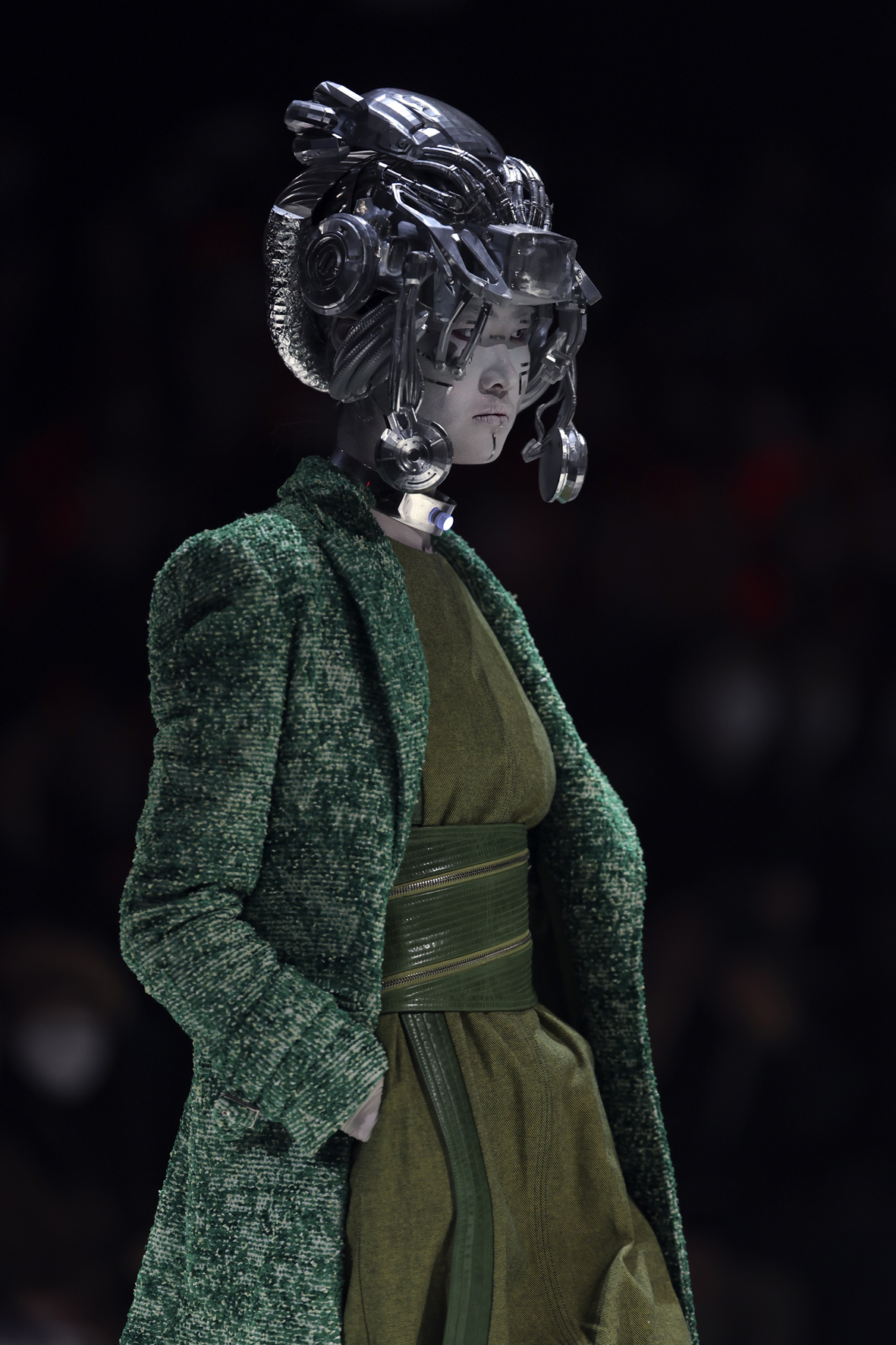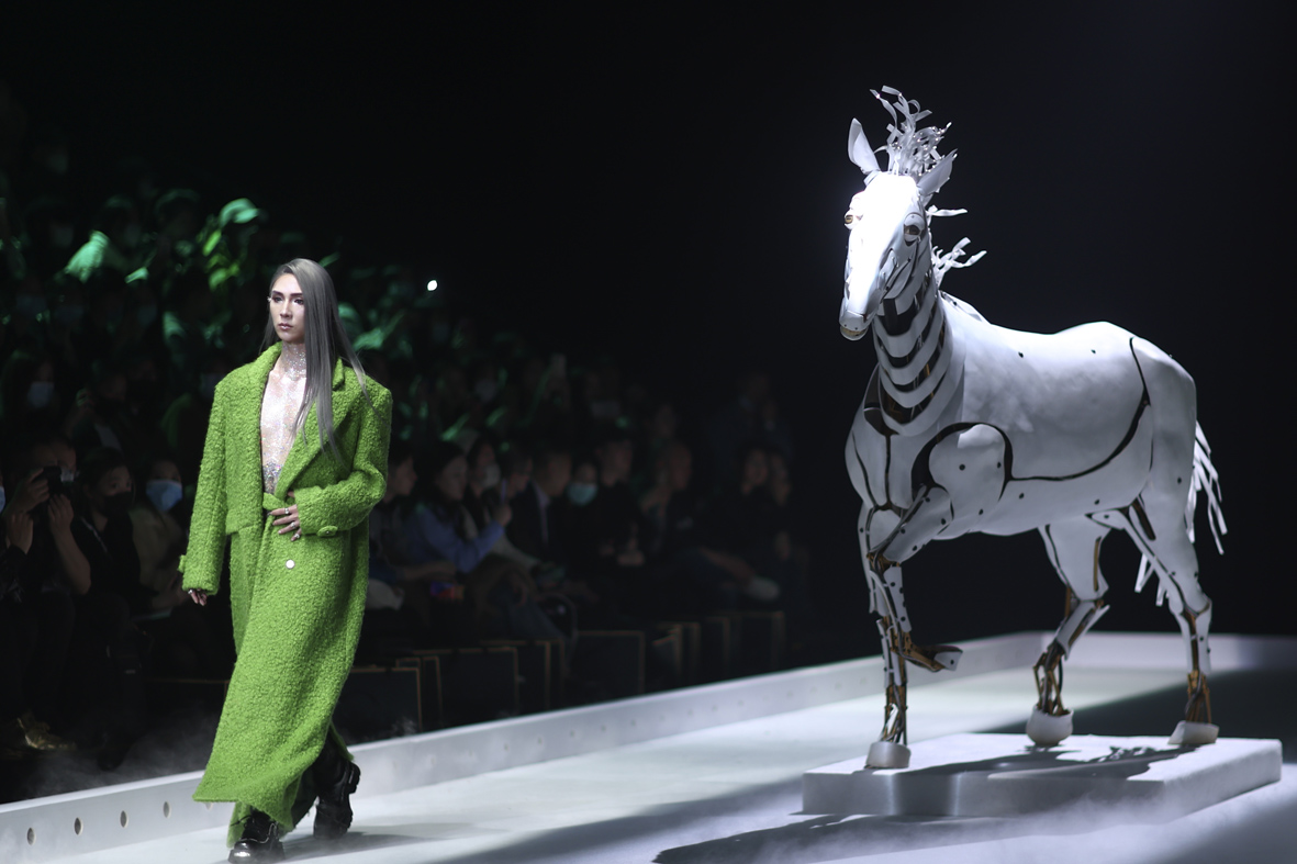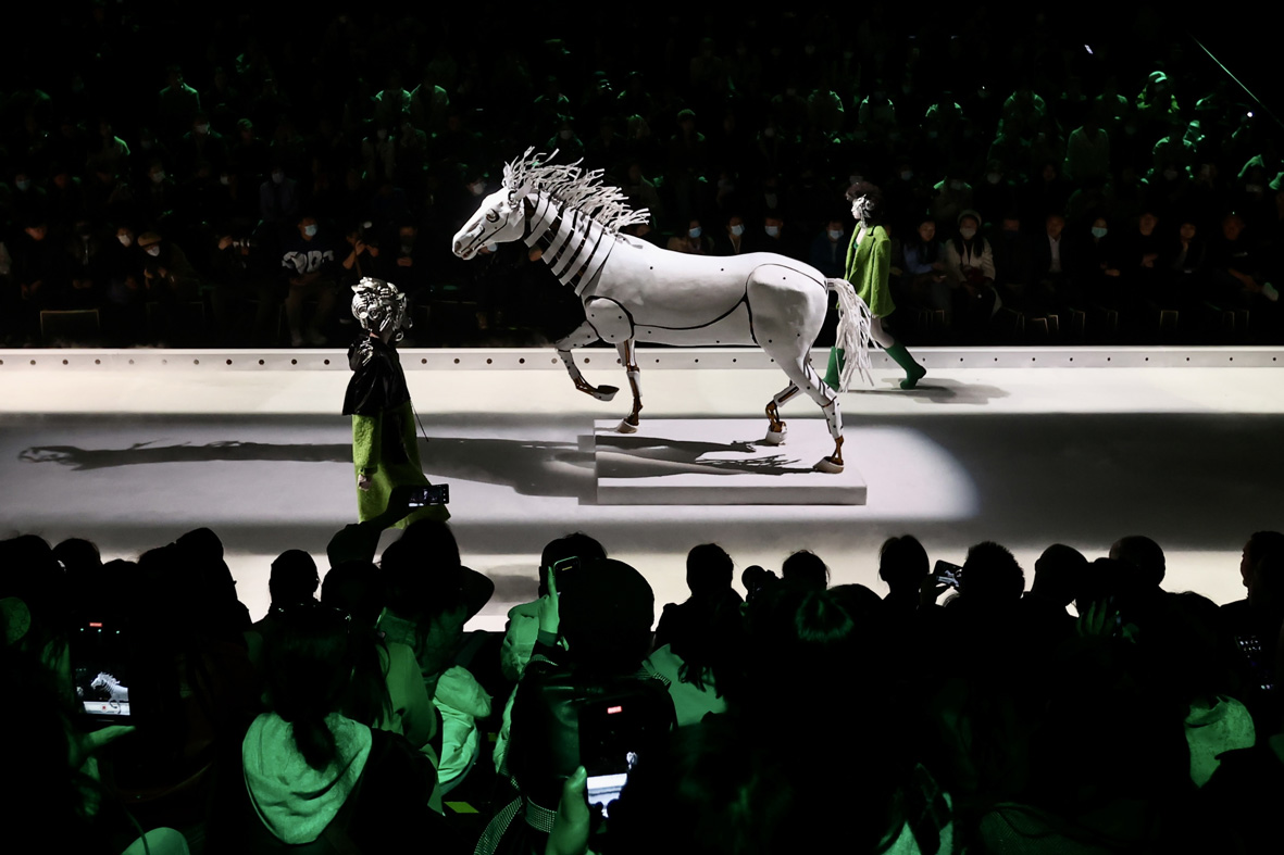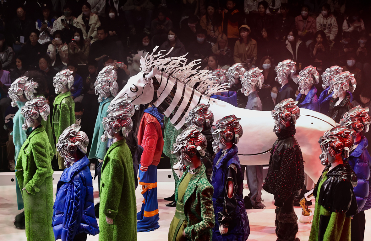 3月26日,北京,设计师丁洁携“视界.边界”系列时装亮相中国国际时装周(2023秋冬系列)。设计师以妇好鸮尊为设计灵感,模特佩戴3D打印发饰,绕行秀场特别设置的“战马”,上演一场历史与未来的“时空对话”。 (图片来源:中新社)