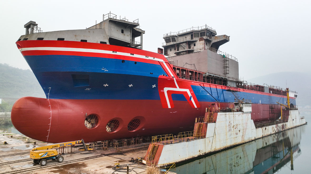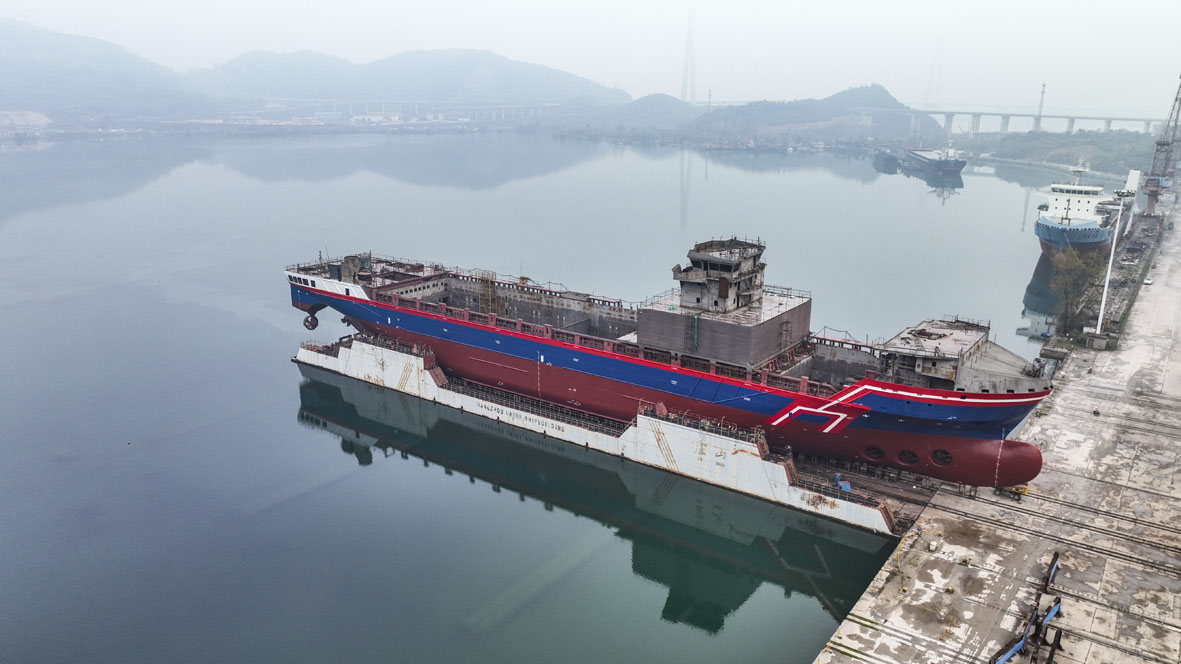 3月30日,江西九江瑞昌市下巢湖,航拍停泊在水面等待舾装的全球最大、中国首艘万吨级远洋通信海缆铺设船“龙吟9”号。“龙吟9”号全长155米,宽23.2米,续航能力为60天,最大航速15节,一次性载缆量可达10000吨,可以一次性完成从中国跨越太平洋的海底光缆铺设。(无人机照片)(图片来源:中新社)