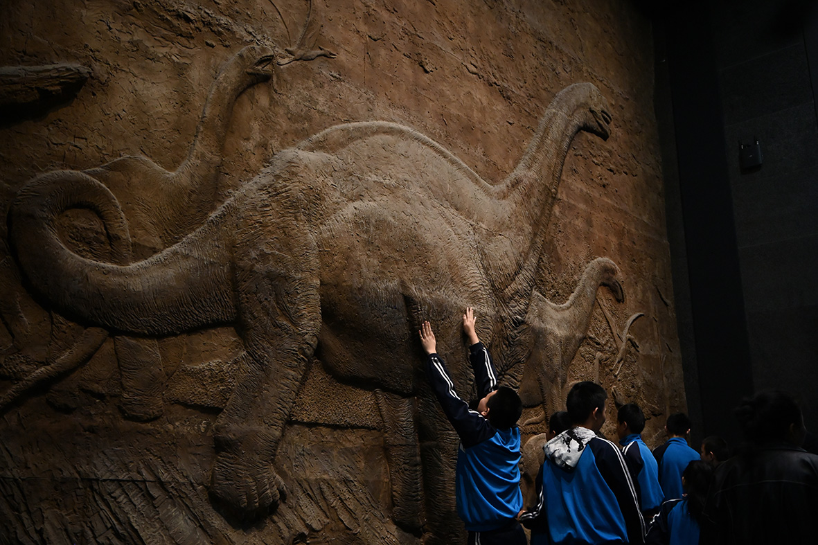 4月4日,内蒙古呼和浩特市,视障学生触摸恐龙浮雕。当日,呼和浩特市特殊教育学校200余名学生来到内蒙古博物院参加“赴博物院的春天之约”活动,学生们通过触觉、听觉、视觉等方式了解博物馆知识,了解历史,感受文化的力量。(图片来源:中新社)