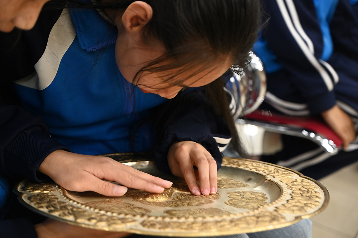 4月4日,内蒙古呼和浩特市,视障学生触摸文物复制品。(图片来源:中新社)