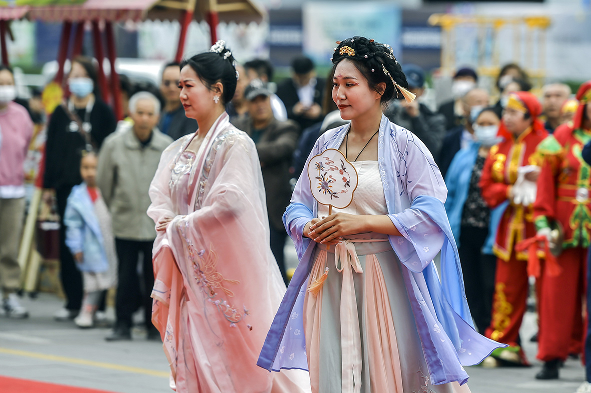 5月1日,新疆乌鲁木齐市沙依巴克区举办彩车巡游、街头文艺表演等活动,吸引众多市民围观。图为市民身着汉服在街头展示。(图片来源:中新社)