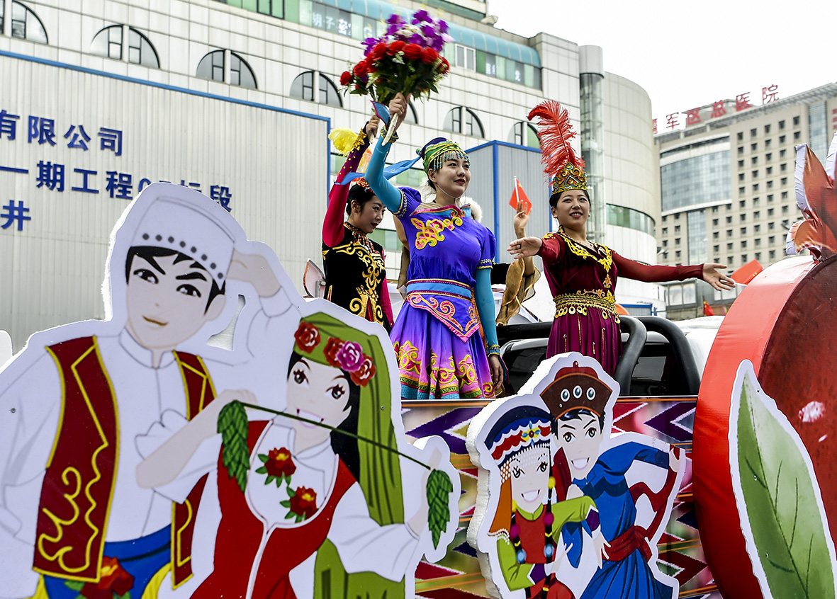 图为彩车上身着民族服饰的工作人员向沿途围观的市民打招呼。(图片来源:中新社)