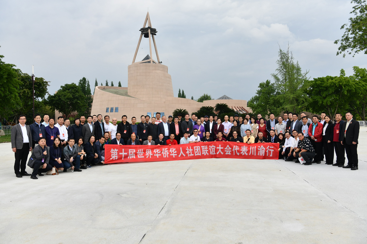 5月10日,四川德阳,第十届世界华侨华人社团联谊大会的侨团代表参观三星堆博物馆后合影。当日,近70位参加第十届世界华侨华人社团联谊大会的侨团负责人飞抵四川成都,开启为期4天的川渝之行。(图片来源:中新社)