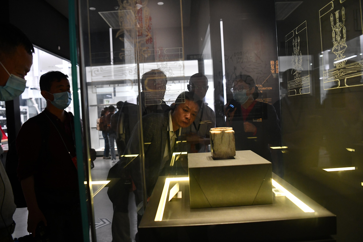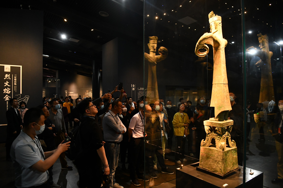 5月10日,四川德阳,第十届世界华侨华人社团联谊大会的侨团代表在三星堆博物馆参观青铜器物。(图片来源:中新社)