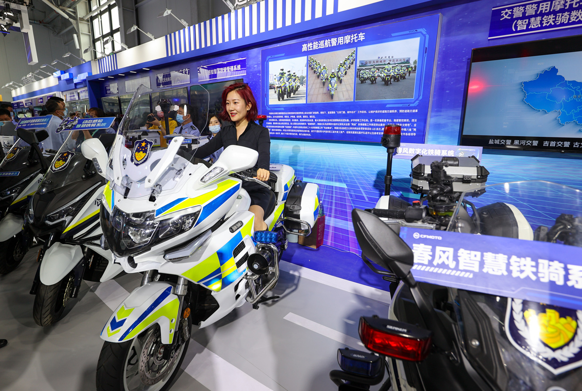 图为观众体验警用摩托车。(图片来源:中新社)