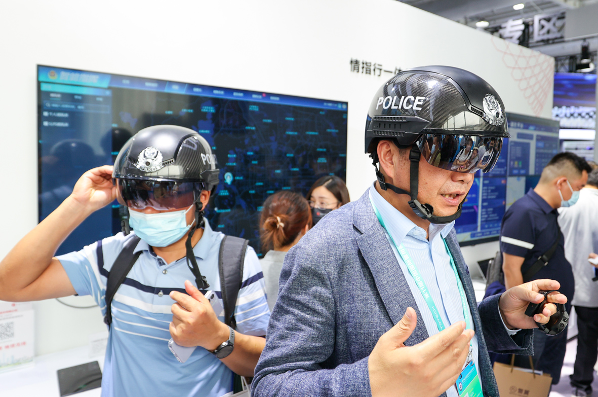 5月11日,第十一届中国国际警用装备博览会在北京首钢会展中心开幕。本届警博会为期4天,展览面积达5.34万平方米,分为公安机关装备馆、国际企业馆、国内企业馆和创新技术产品发布区,619家国内企业,40家境外企业参展。图为观众试戴警用智能头盔。(图片来源:中新社)
