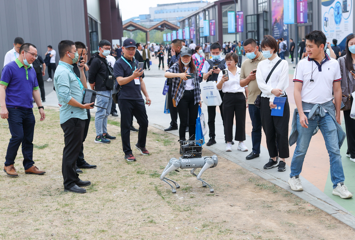 图为一家展商在室外演示机器狗的喊话功能。(图片来源:中新社)