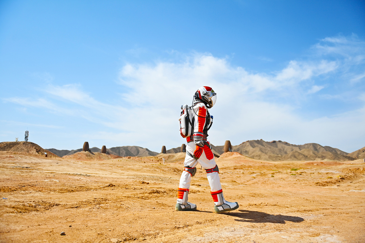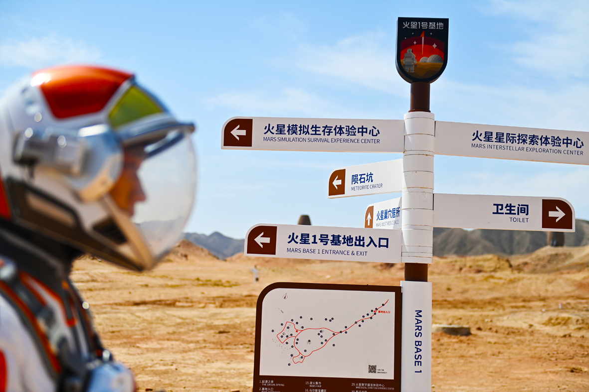 5月15日,体验者在火星1号基地内进行出舱漫步训练。“火星1号基地”位于甘肃省金昌市,由中国航天员科研训练中心和中国航天科技国际交流中心指导建设。此地的戈壁滩拥有与火星最为相似的地形地貌特征。基地通过火星生存场景模拟、实体建筑仿制、科幻造景等手段,打造出中国首个火星主题沉浸式实景体验基地。(图片来源:中新社)