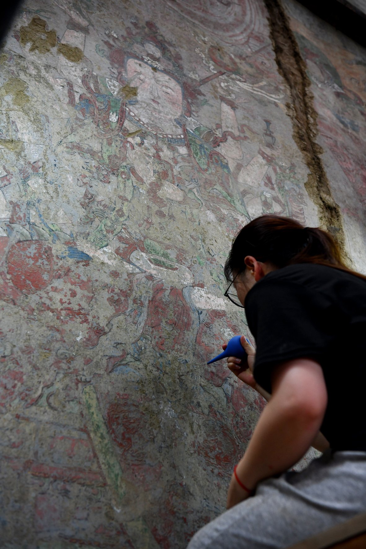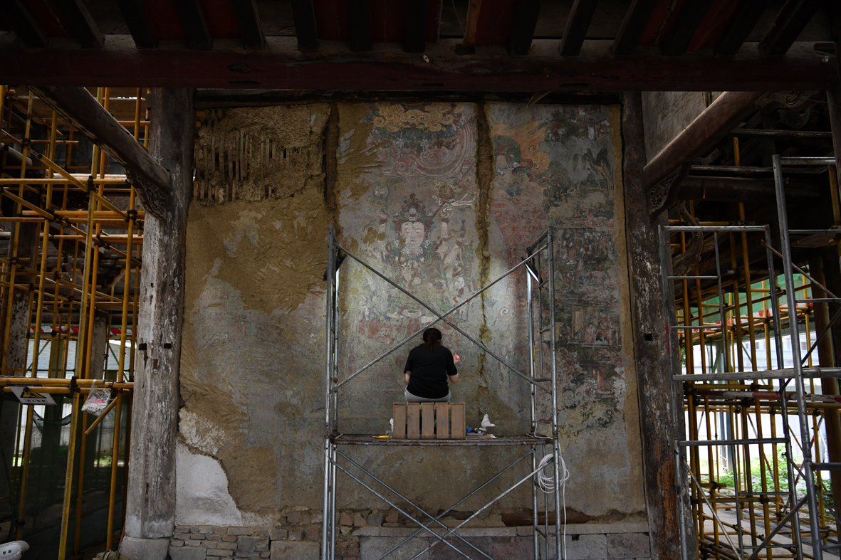5月30日,四川省成都市青白江区城厢古城明教寺觉皇殿壁画修复现场,明代重层壁画修复工作有序开展。这是四川省目前发现的唯一明代重层壁画,其全貌于近日重见天日。(图片来源:中新社)