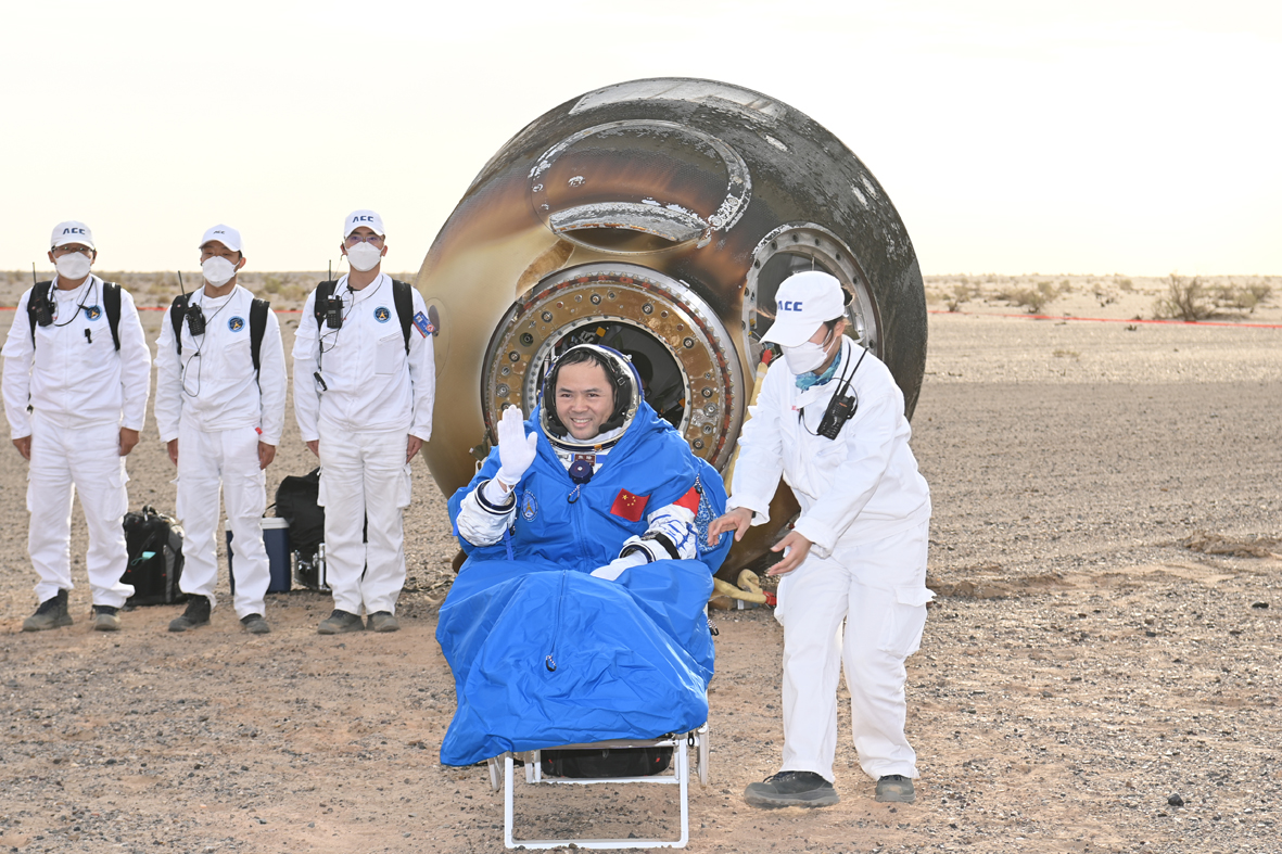 6月4日,神舟十五号载人飞船返回舱在东风着陆场成功着陆,现场医监医保人员确认航天员费俊龙、邓清明、张陆身体状态良好,神舟十五号载人飞行任务取得圆满成功。图为航天员费俊龙安全顺利出舱。(图片来源:中新社)
