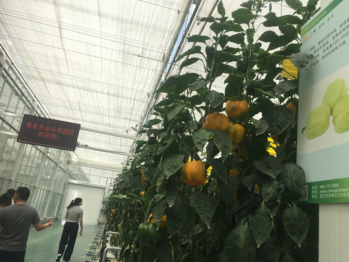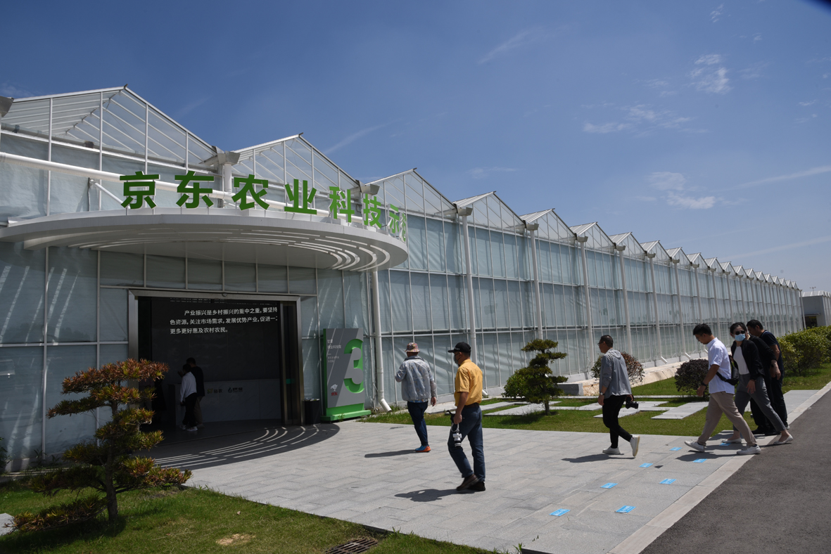 芒种时节,气温上升。江苏省宿迁市京东农业科技示范围內的智能化玻璃温室,温度被精确控制在25度左右。园区还聘请了俄罗斯自然科学院院士兰玉彬等多位专家提供技术支持。近日,“2023行走中国·海外华文媒体宿迁行”活动展开。来自《俄罗斯龙报》等12家华文媒体记者感受“水润之城”、“电商名城”的绿色发展。图为华文媒体代表在京东农业科技示范园参观。(图片来源:本报记者