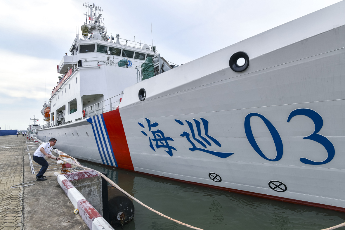 6月8日16时50分许,海南省海口市,大型巡航救助船“海巡03”轮驶离海口海事监管基地码头,标志着海南海事局2023年环海南岛暨西沙海域巡航值守活动启动。图为工作人员将“海巡03”轮的缆绳解开。(图片来源:中新社)