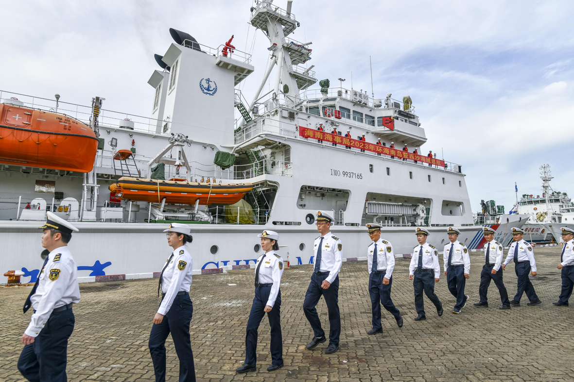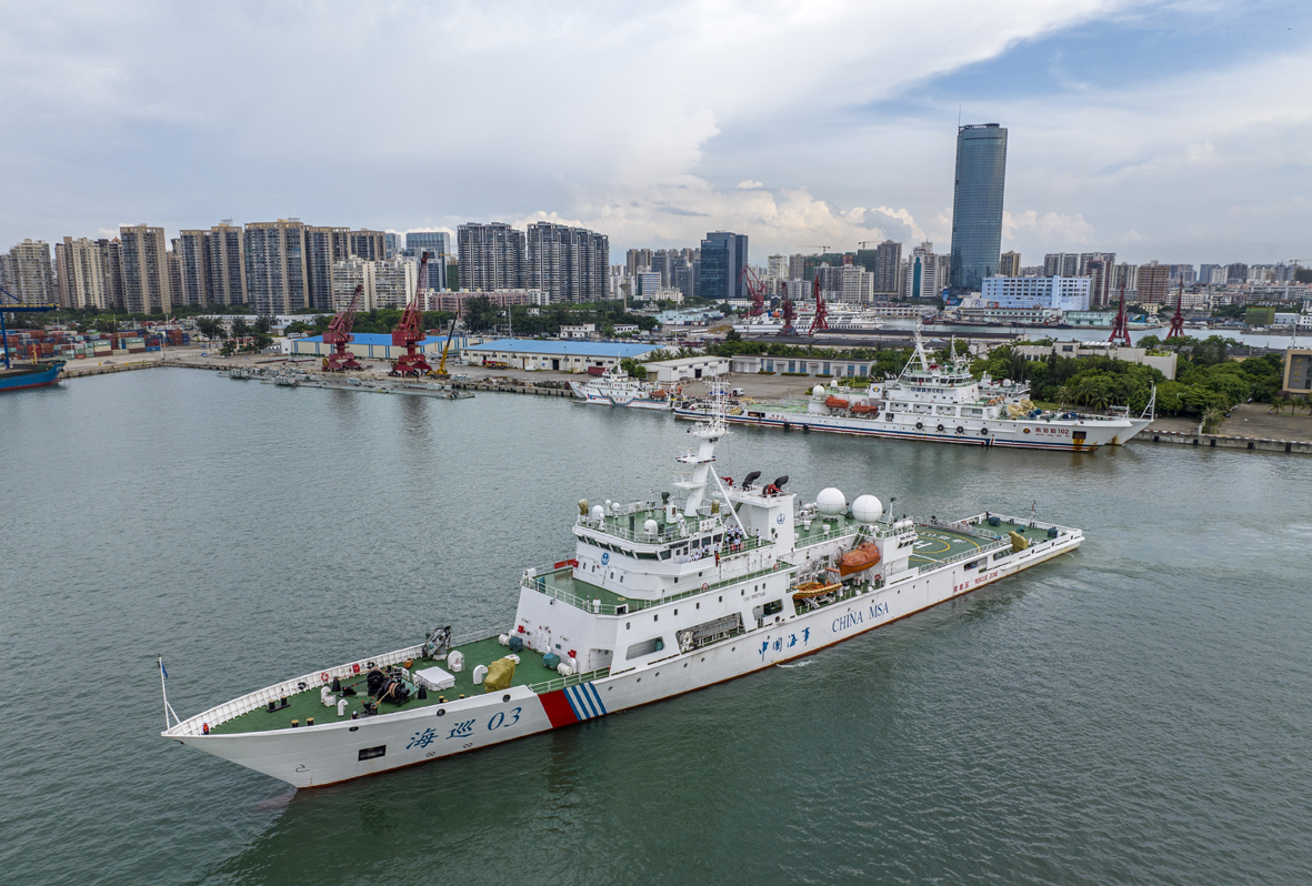 6月8日16时50分许,海南省海口市,大型巡航救助船“海巡03”轮驶离海口海事监管基地码头,标志着海南海事局2023年环海南岛暨西沙海域巡航值守活动启动。(无人机照片)(图片来源:中新社)