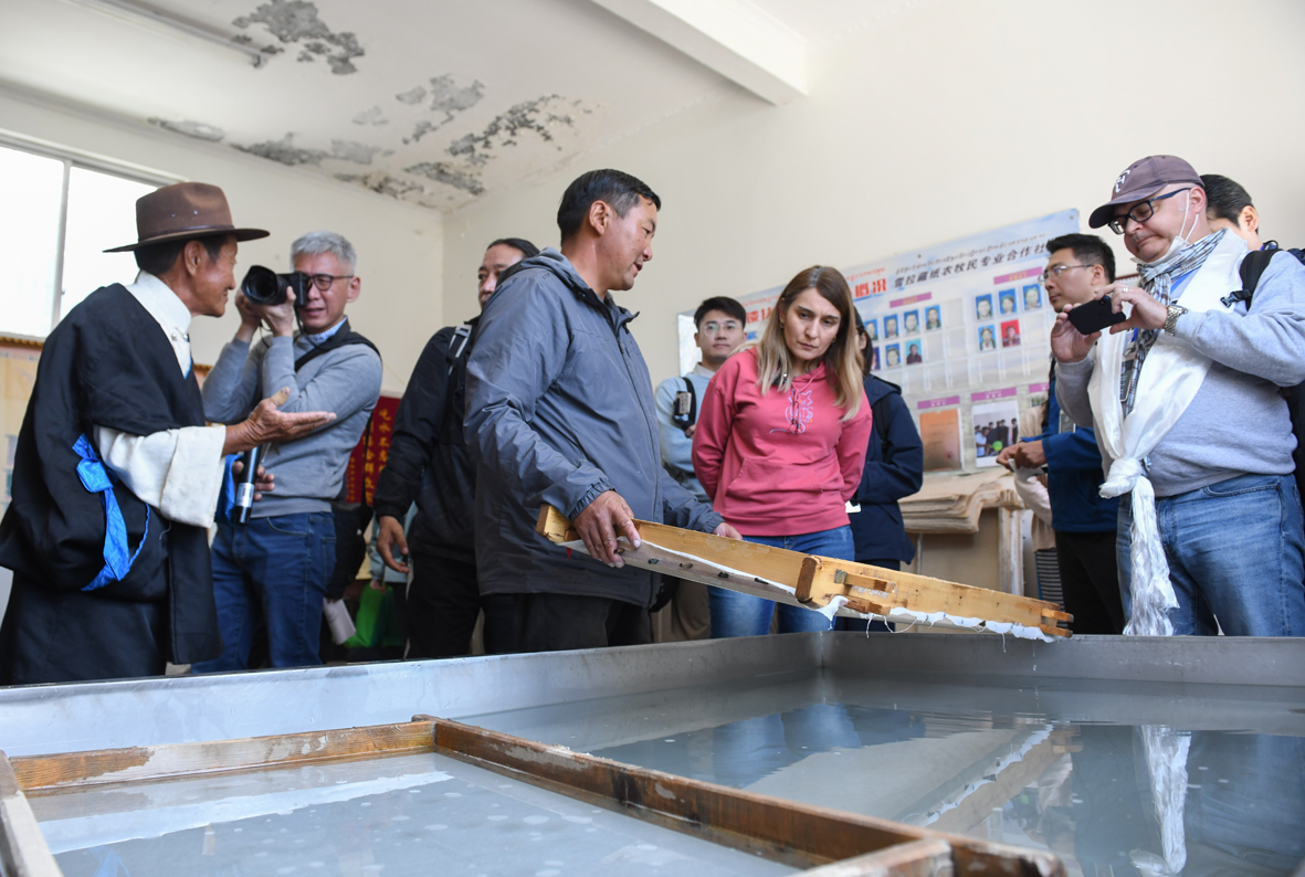 6月15日,西藏拉萨,记者们在尼木县非遗工坊(藏纸制作厂)采访拍摄。(图片来源:中新社)