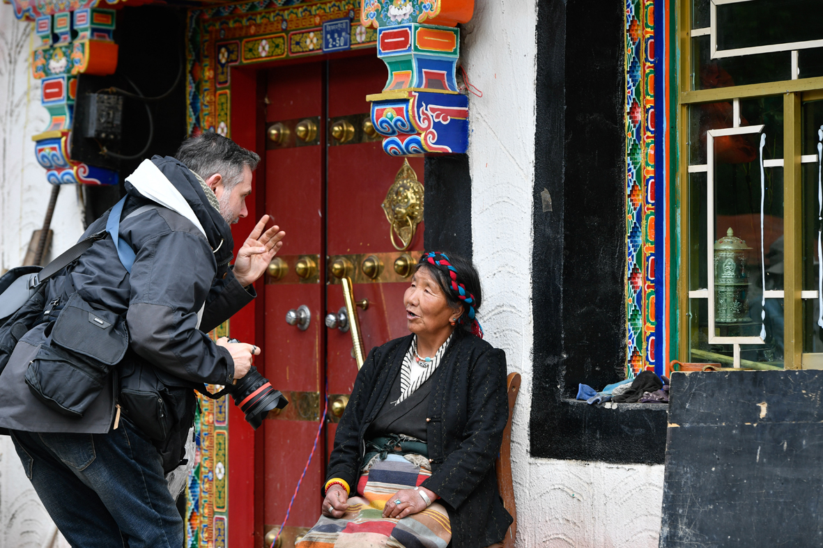 6月15日,西藏拉萨,记者在尼木县吞巴镇吞达村跟当地藏族民众交流。(图片来源:中新社)