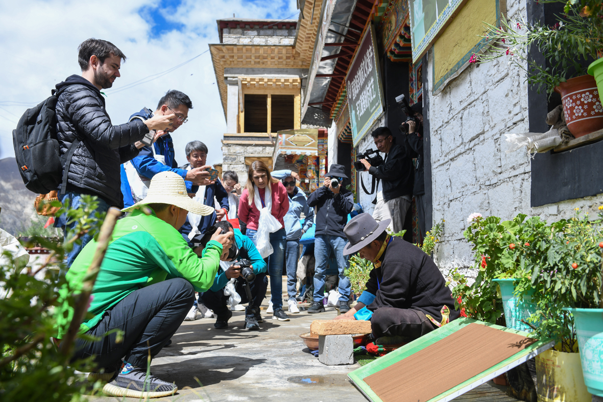 6月15日,西藏拉萨,中外记者们在尼木县吞巴镇吞达村采访拍摄藏香制作过程。在第五届中国西藏旅游文化国际博览会召开之际,国务院新闻办组织中外媒体记者赴西藏采访,路透社、共同社、西班牙埃菲社、意大利安莎社、新加坡《联合早报》和中央广电总台、中国日报等15家媒体的20名记者参加。6月15日,采访团一行前往拉萨市尼木县参访体验西藏传统藏香、藏纸文化。(图片来源:中新社)
