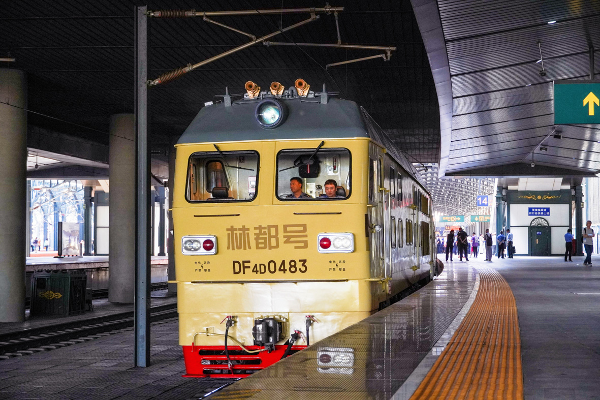 6月18日,黑龙江哈尔滨,即将发车的旅游观光列车“林都号”。当日,“林都号”旅游列车首发仪式在黑龙江哈尔滨举行,载着200余名乘客的Y523次“林都号”旅游专列,开启了发往“林都伊春”的避暑之旅。据了解,"林都号"旅游专列车厢编组包括高级软卧、中西餐厅、儿童游乐室、医疗室等多功能车厢,带给旅客高品质的列车观光体验。(图片来源:中新社)