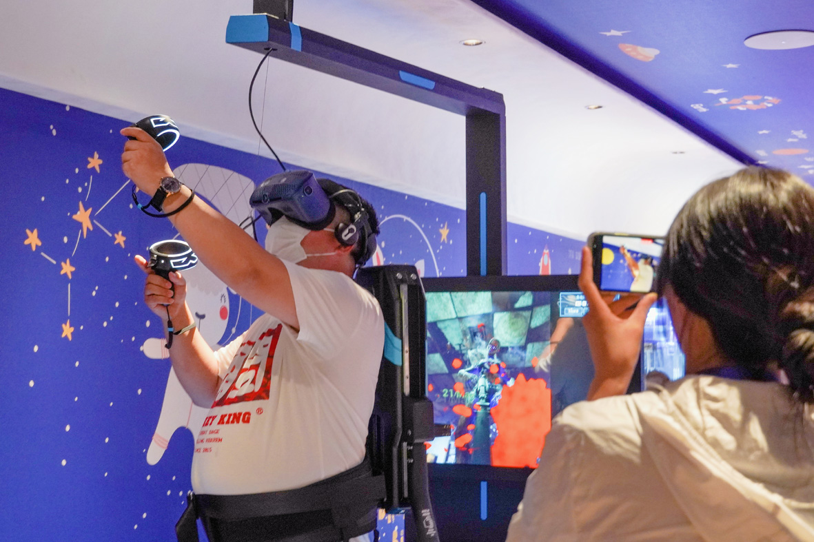 6月18日,旅客在“林都号”里体验VR游戏娱乐。(图片来源:中新社)