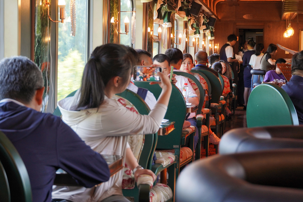 6月18日,旅客在“林都号”爵士音乐酒吧用餐。(图片来源:中新社)