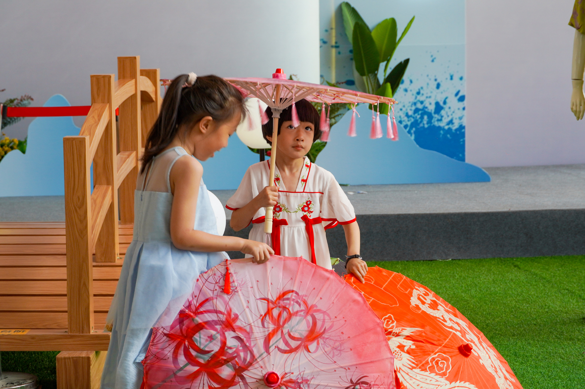 6月25日,黑龙江哈尔滨,孩童观赏丝绸伞。(图片来源:中新社)