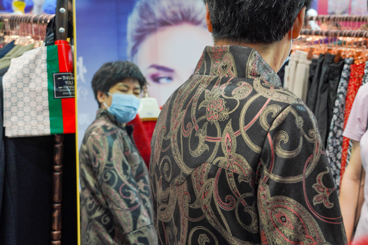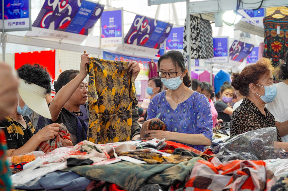 6月25日,黑龙江哈尔滨,观众选购丝绸服饰。(图片来源:中新社)