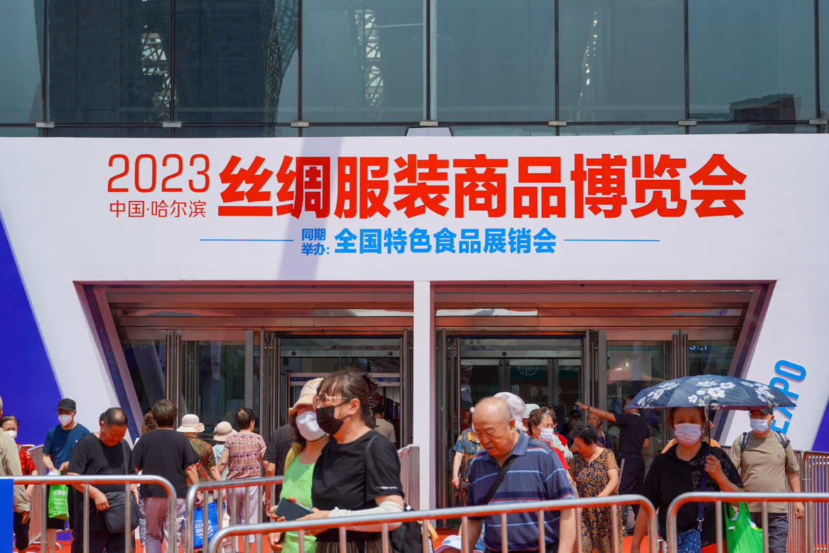 6月25日,黑龙江哈尔滨,观众前往丝绸博览会观展。当日,正在举行的2023中国(哈尔滨)丝绸服装商品博览会,吸引了众多市民观展、选购。(图片来源:中新社)