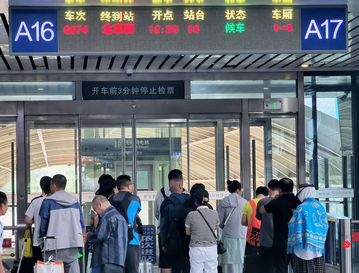 图为西宁火车站候车大厅内,搭乘西宁至北京西首趟高铁列车的乘客等待检票。(图片来源:中新社)