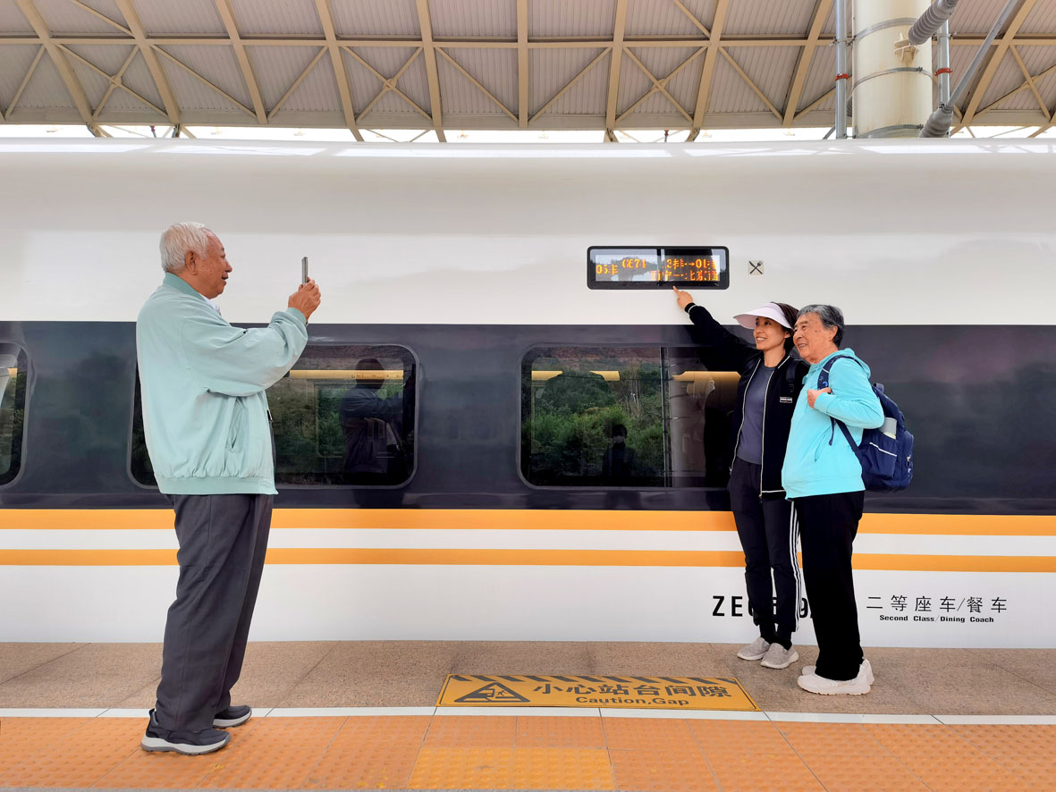 图为西宁至北京西首趟高铁列车在西宁火车站停靠,乘坐首趟高铁列车的旅客与列车合影留念。(图片来源:中新社)