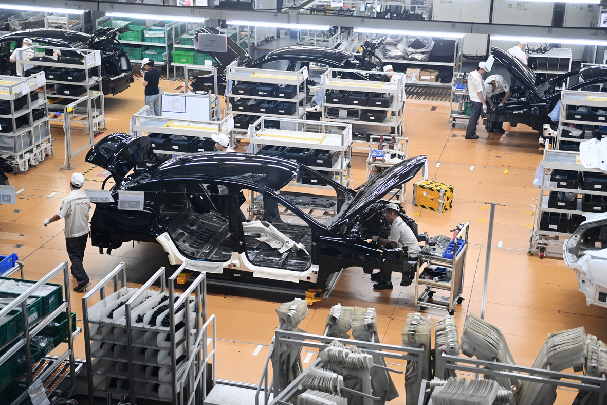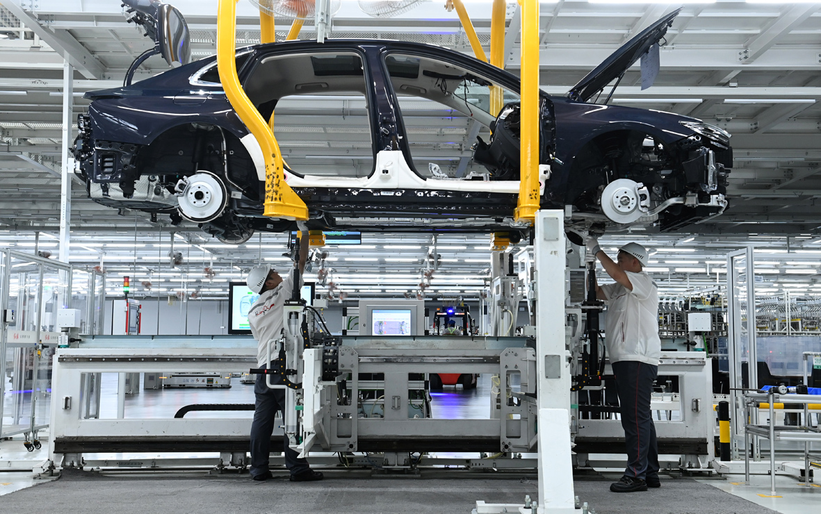 7月5日,在位于吉林长春的中国一汽红旗制造中心繁荣厂区,工人在进行车体安装。(图片来源:中新社)