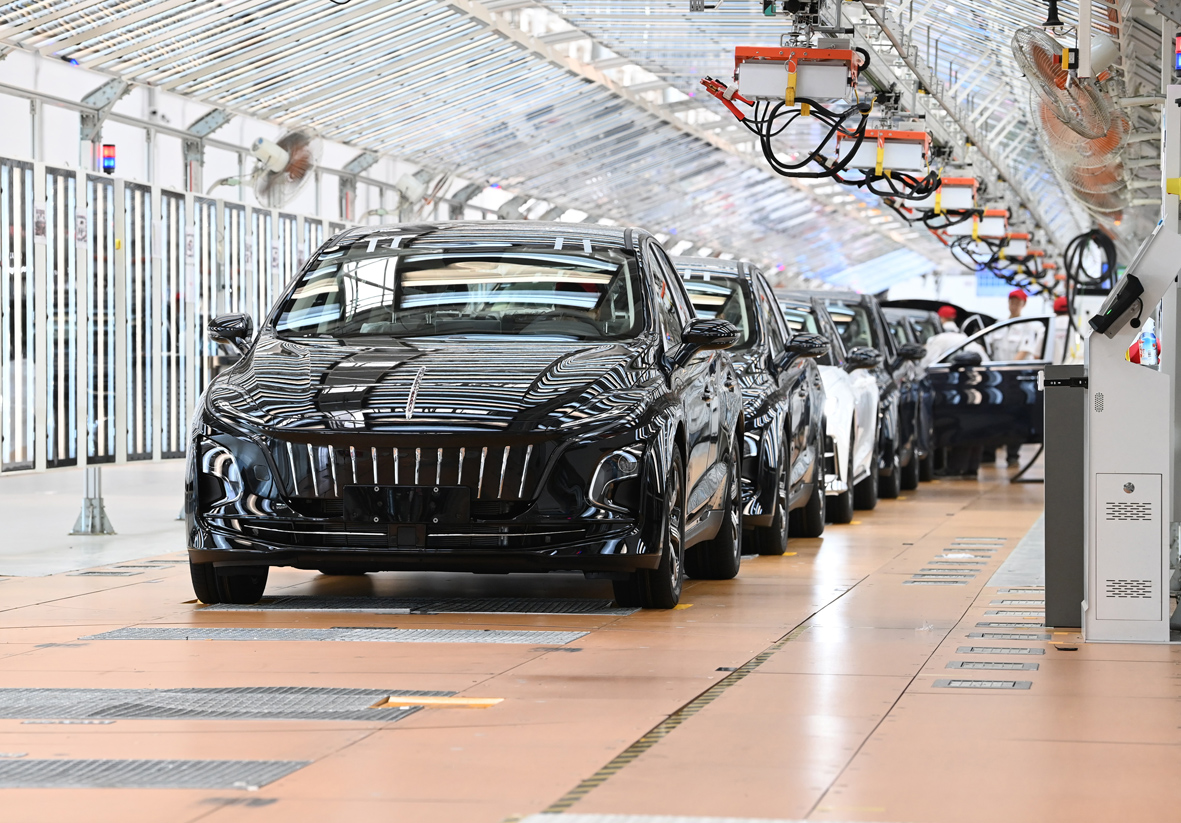 7月5日,在位于吉林长春的中国一汽红旗制造中心繁荣厂区,工人在车辆终检生产线进行质检。(图片来源:中新社)